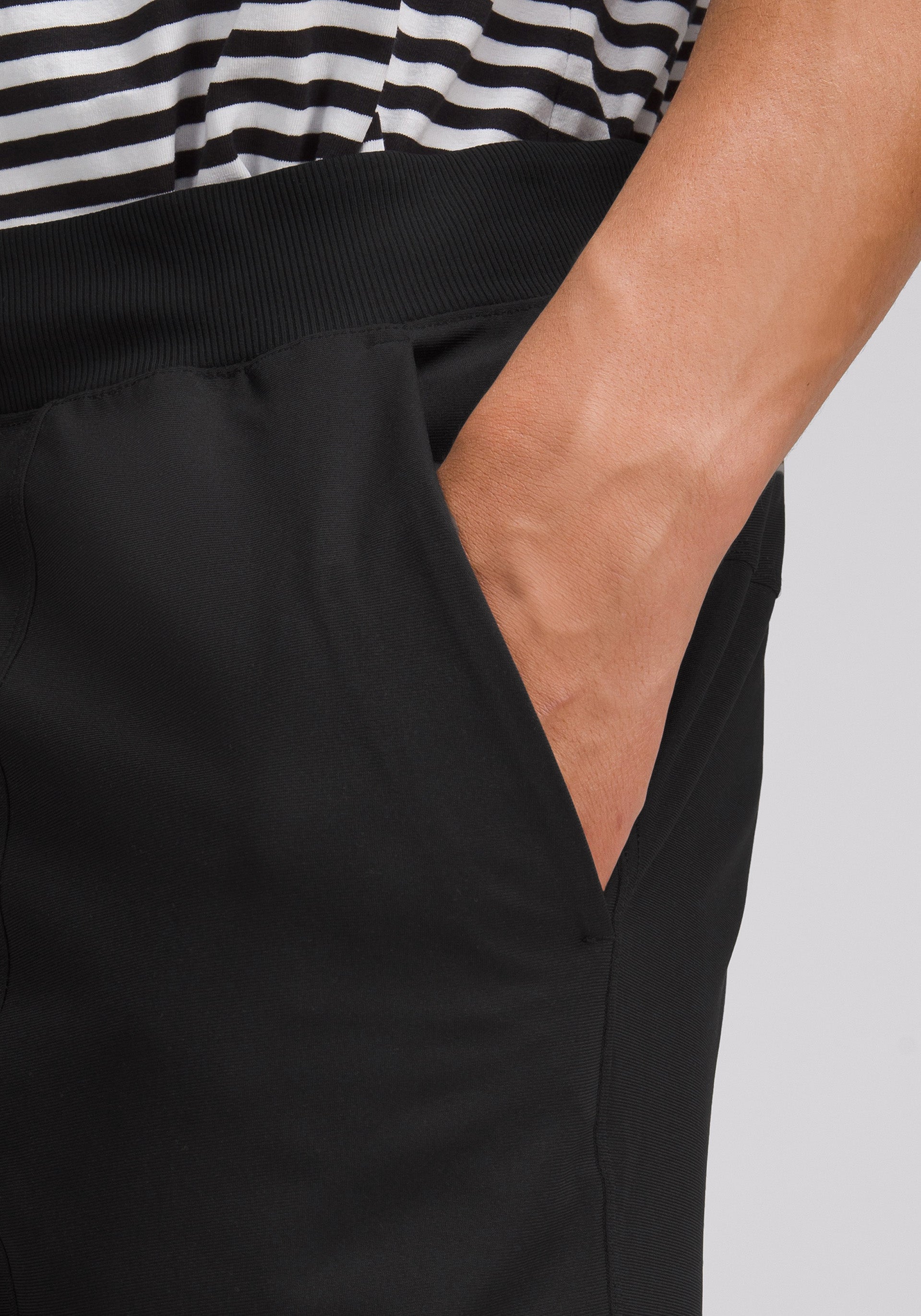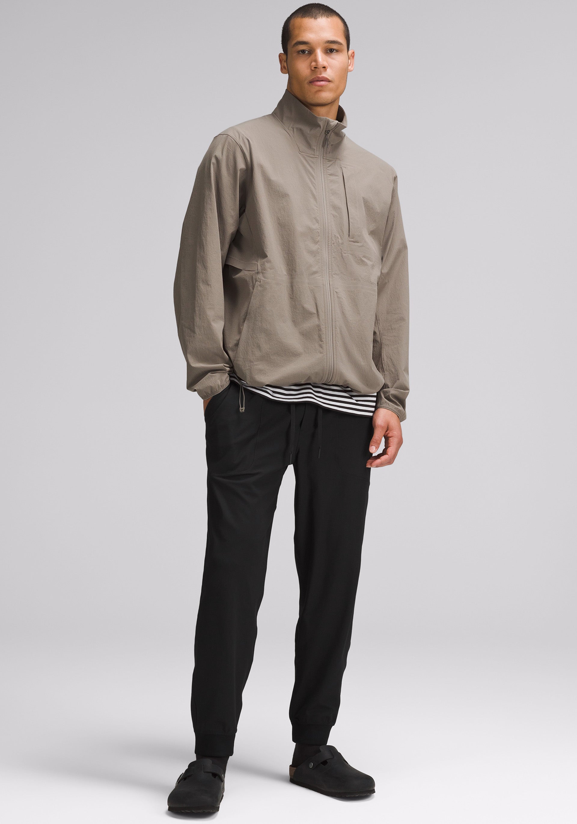 • Tapered jogger with waistband drawcord that can be worn facing out or inside, side hand pockets, and discreet back pocket.