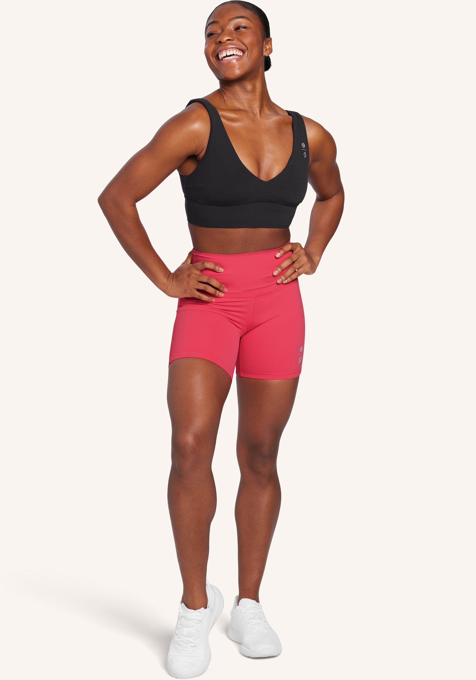 High rise, 6” inseam short with hidden waistband pocket fits a card or a key, and won’t get in your way