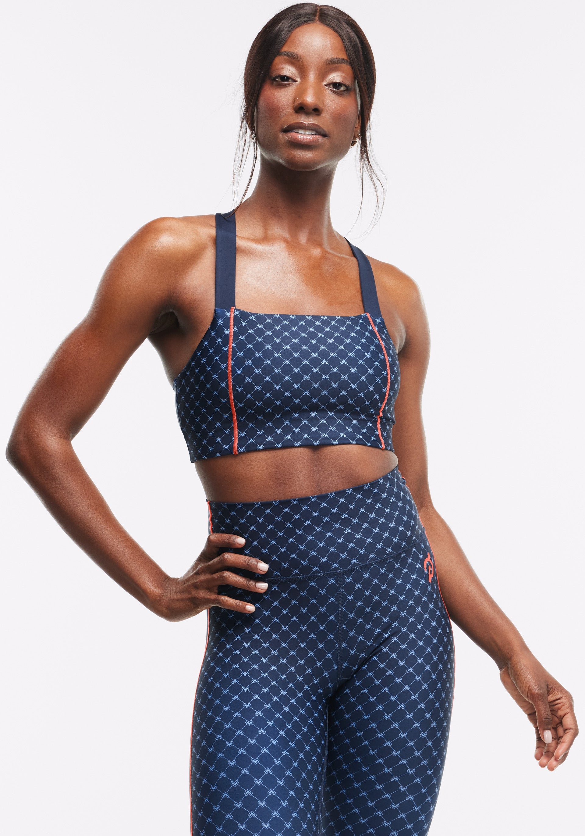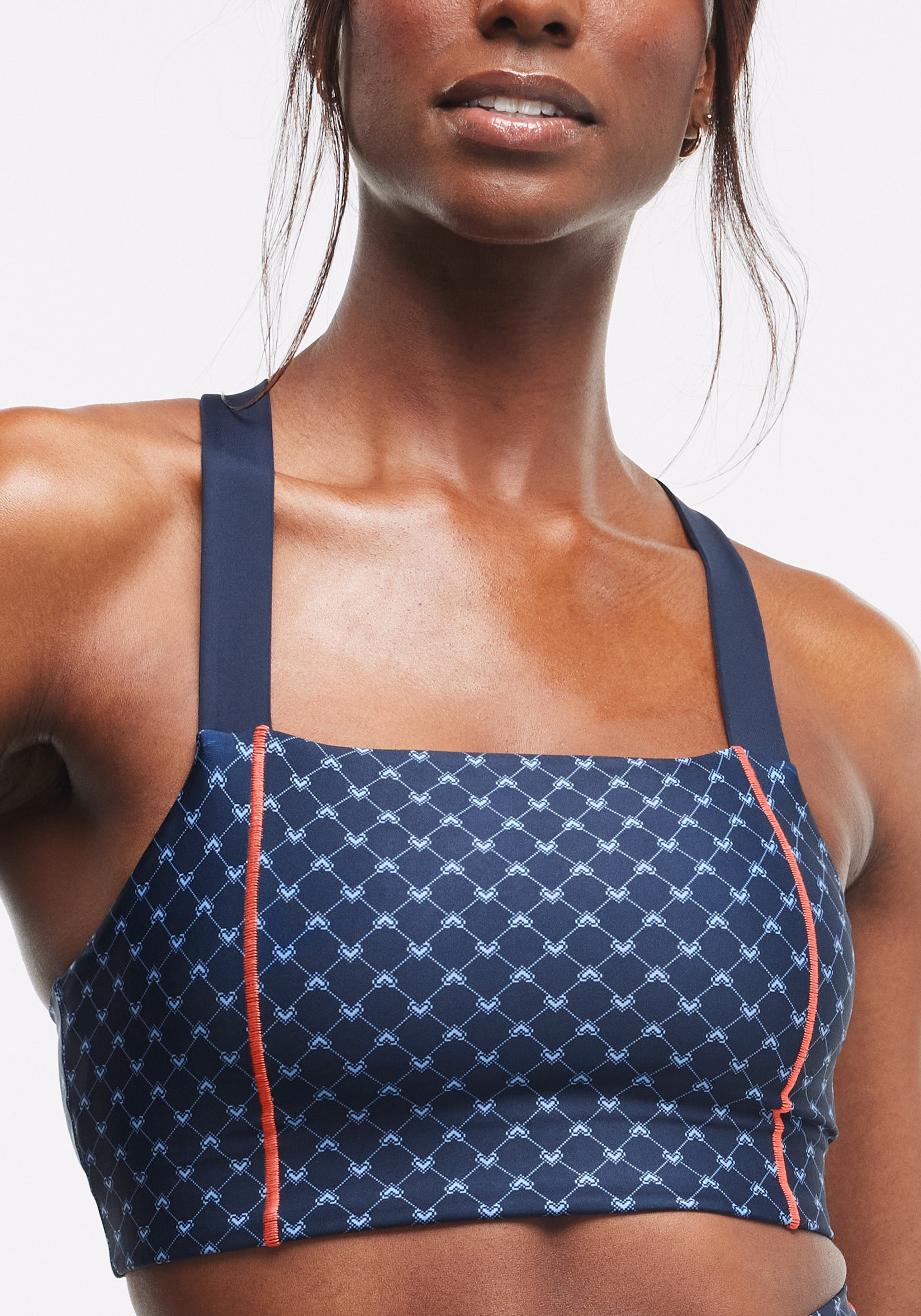- Low-Medium support square neck bra with contrast stitch, elastic straps, interior sweat channel encased elastic band, and removable cup pads