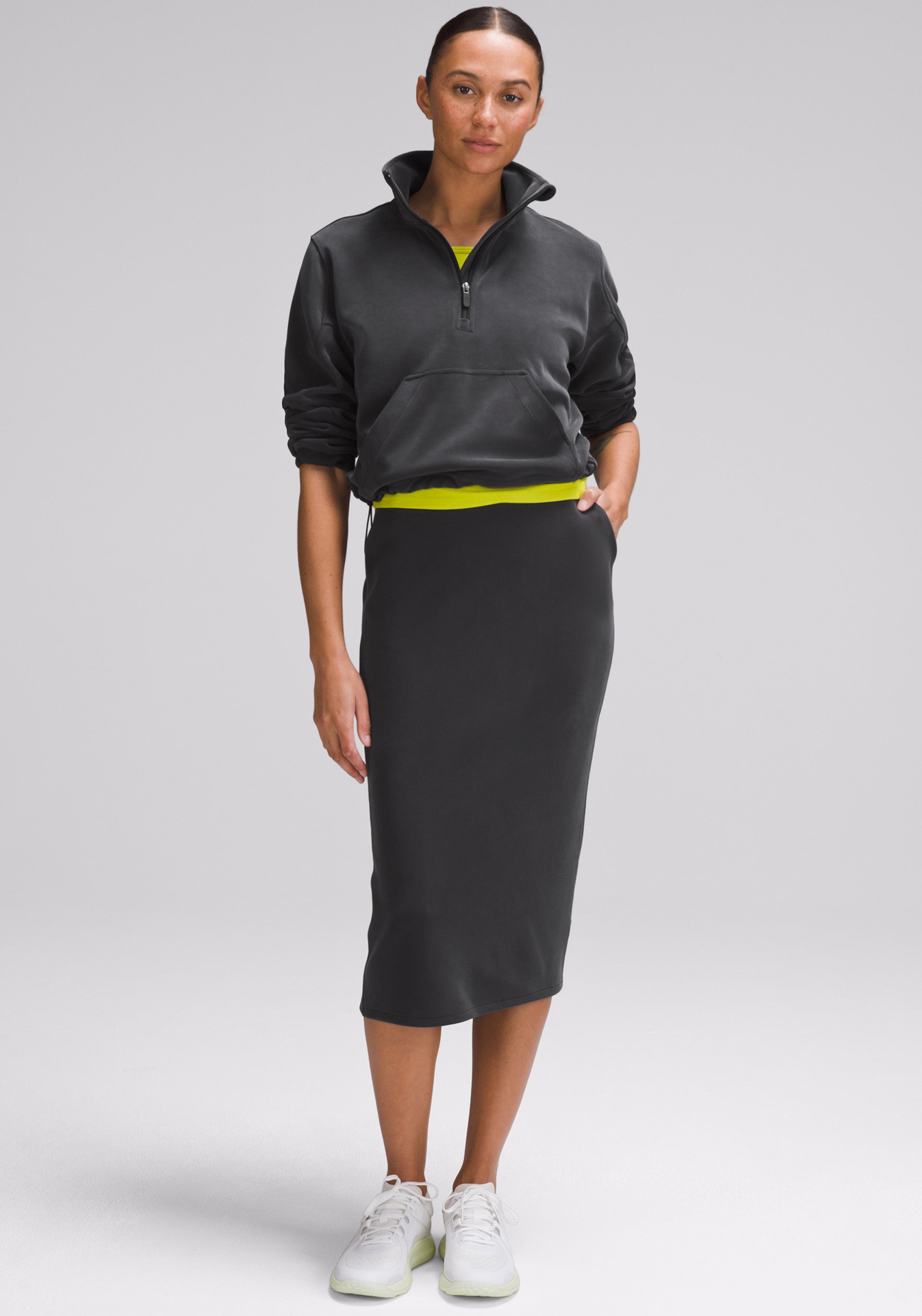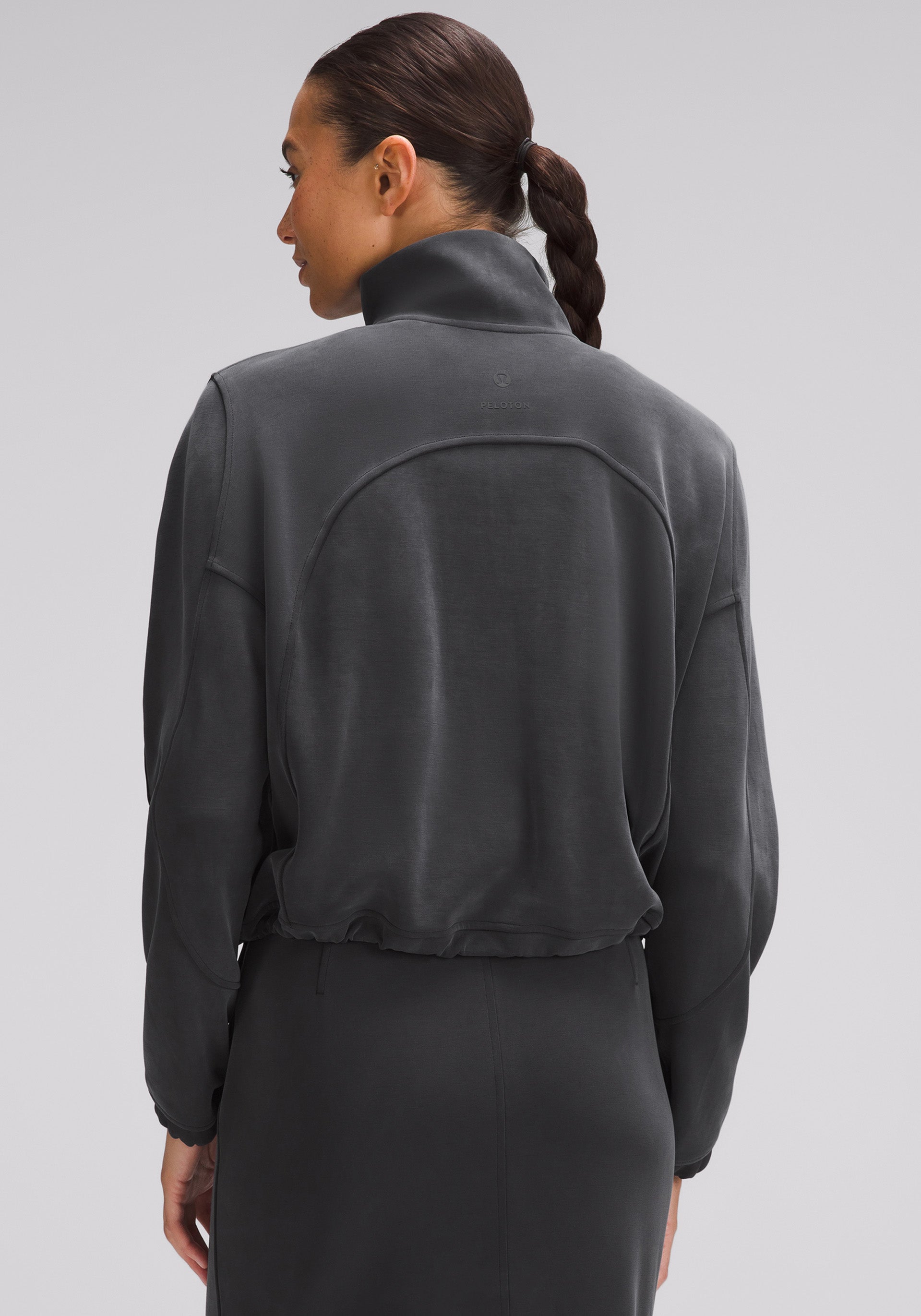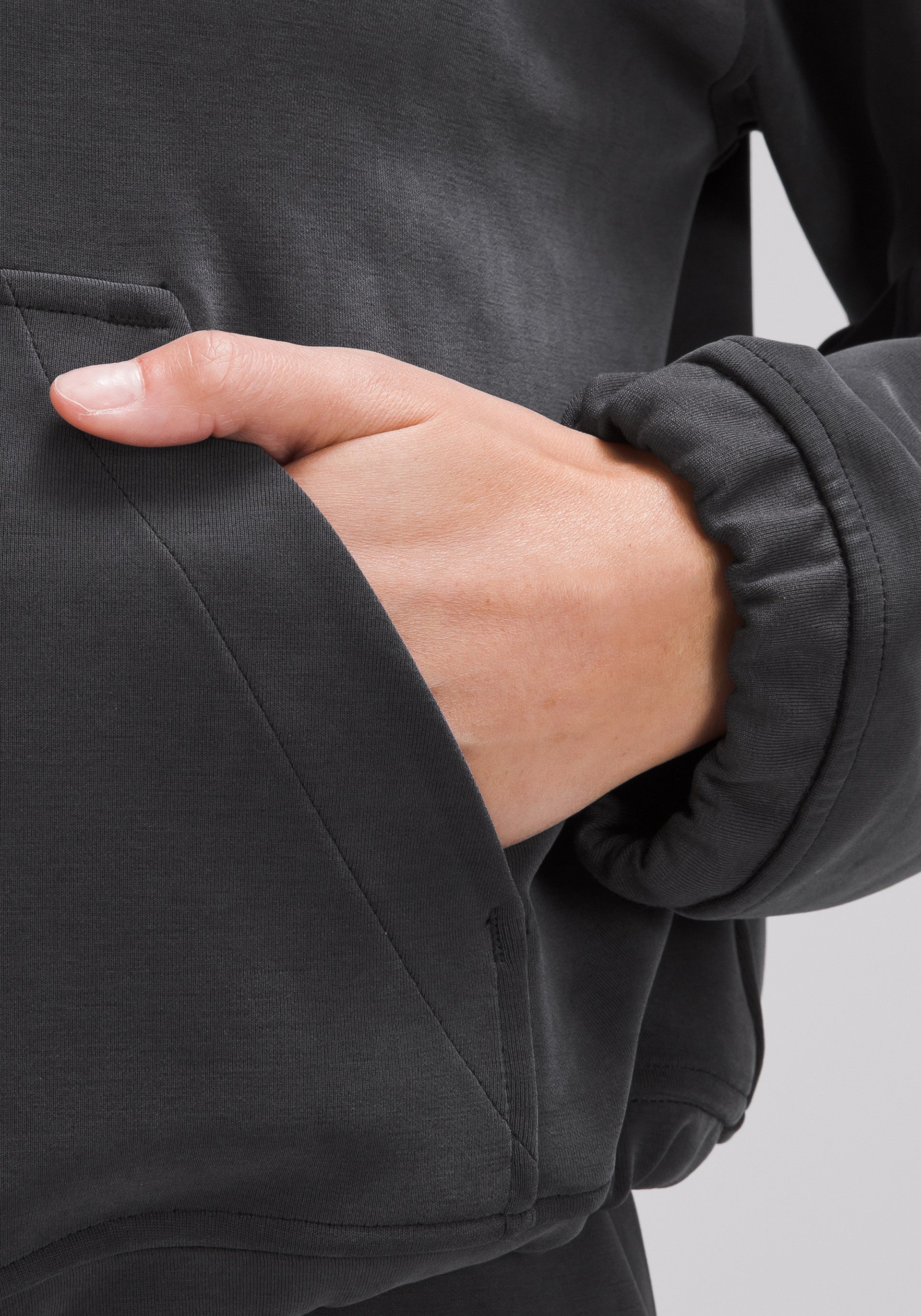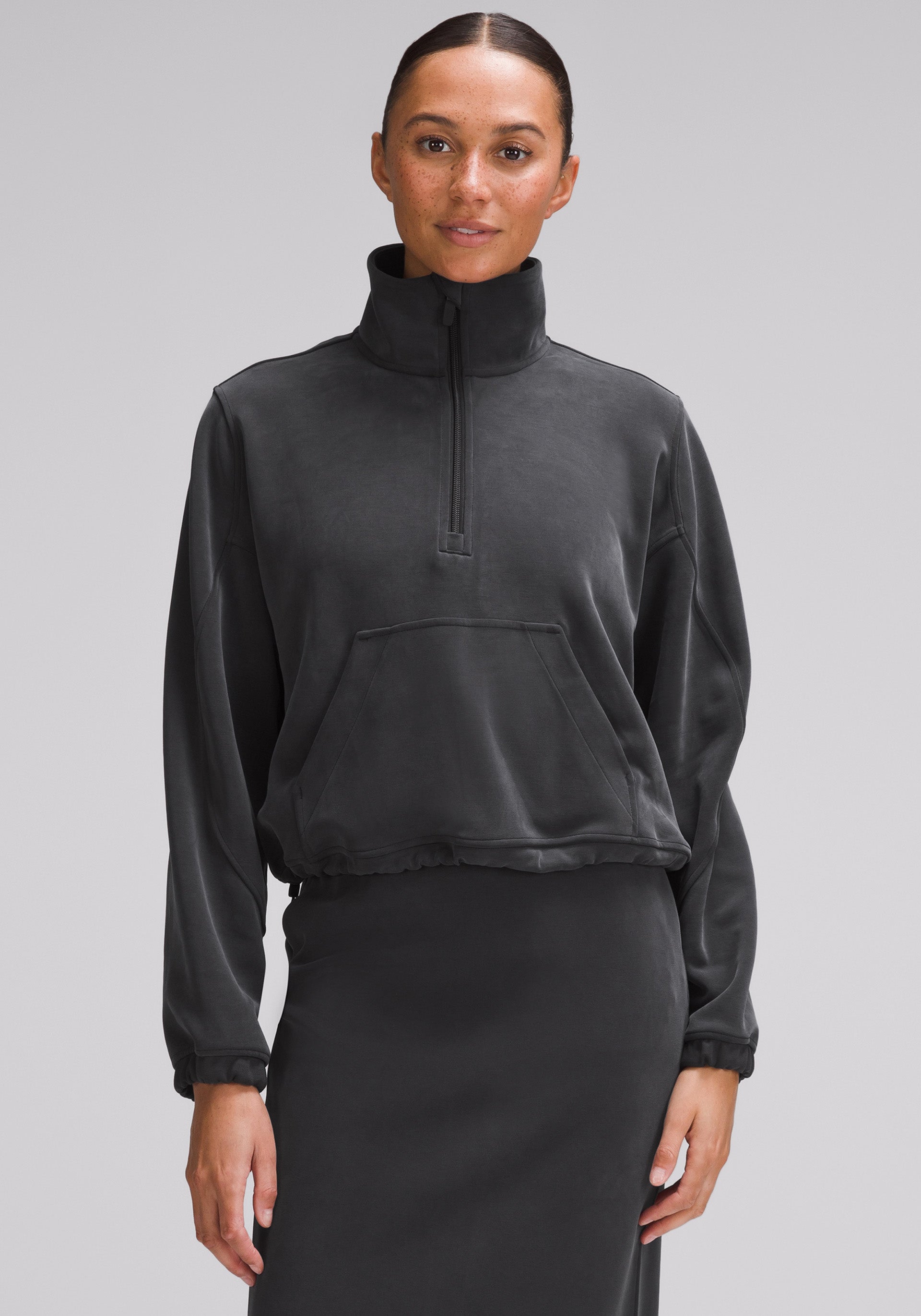 Relaxed half zip with kangaroo pocket, hidden card sleeve, zipper garage and placket, and a cinchable hem for a custom fit