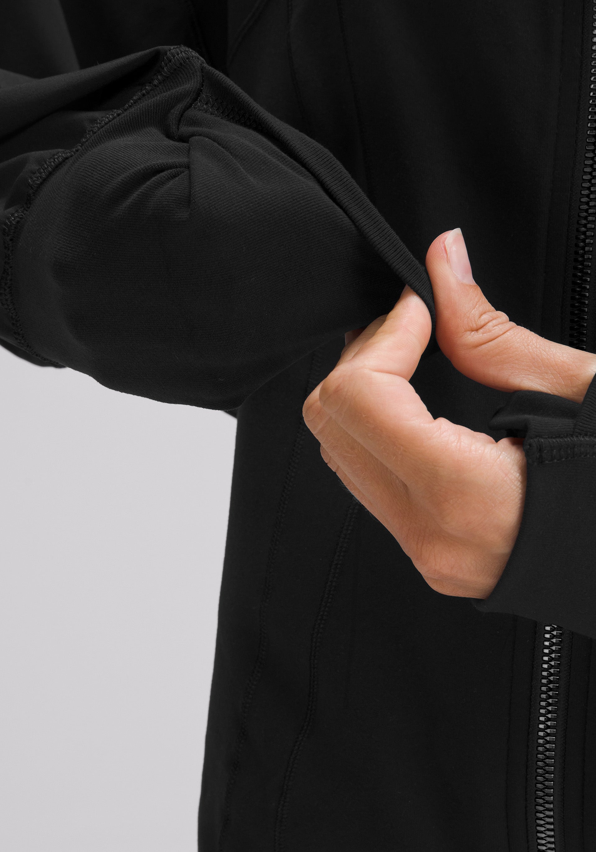 Full-zip jacket with secure front pockets with a hidden phone sleeve, cinchable shock cord at hem, zipper garage, and locker loop for easy hanging