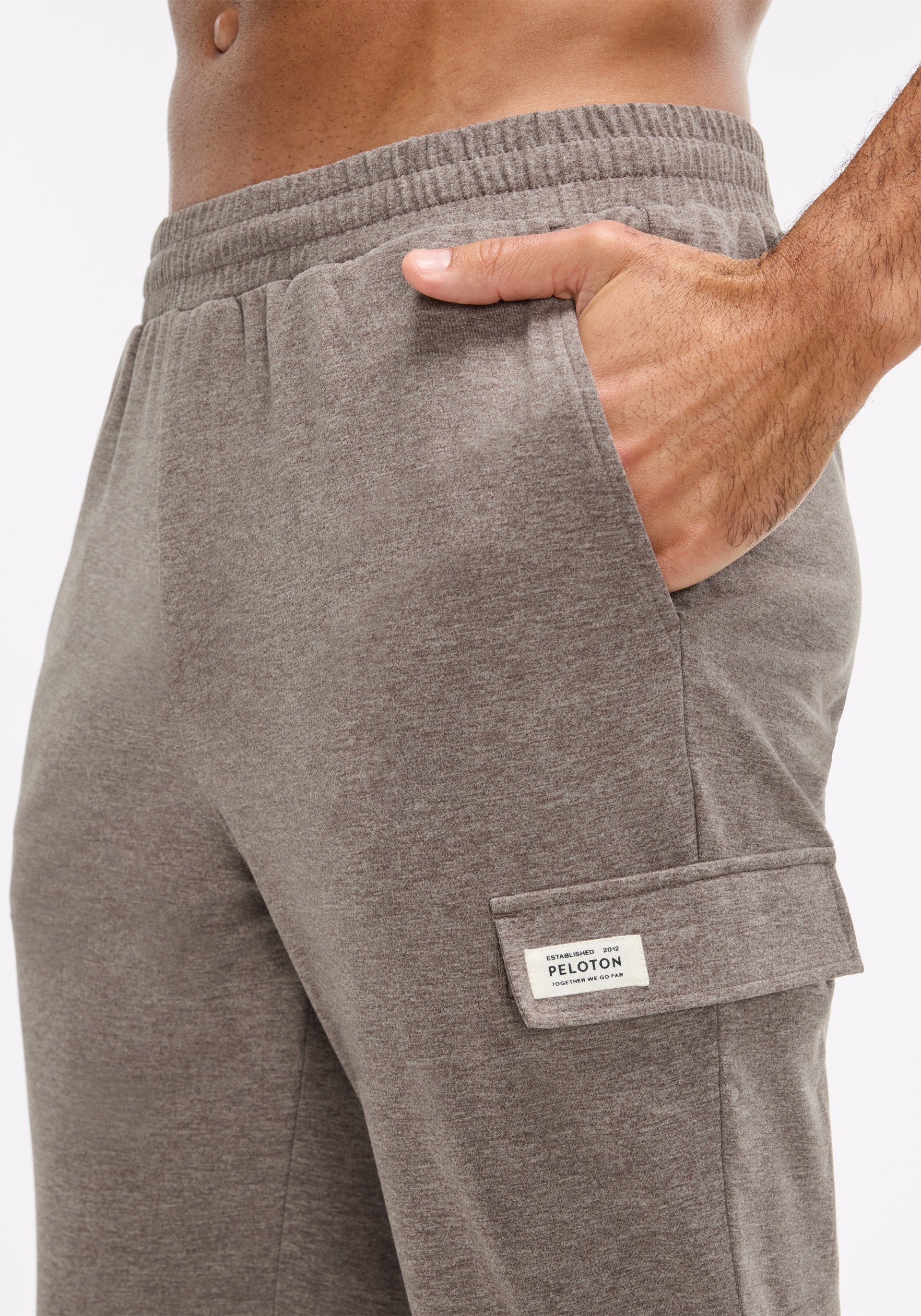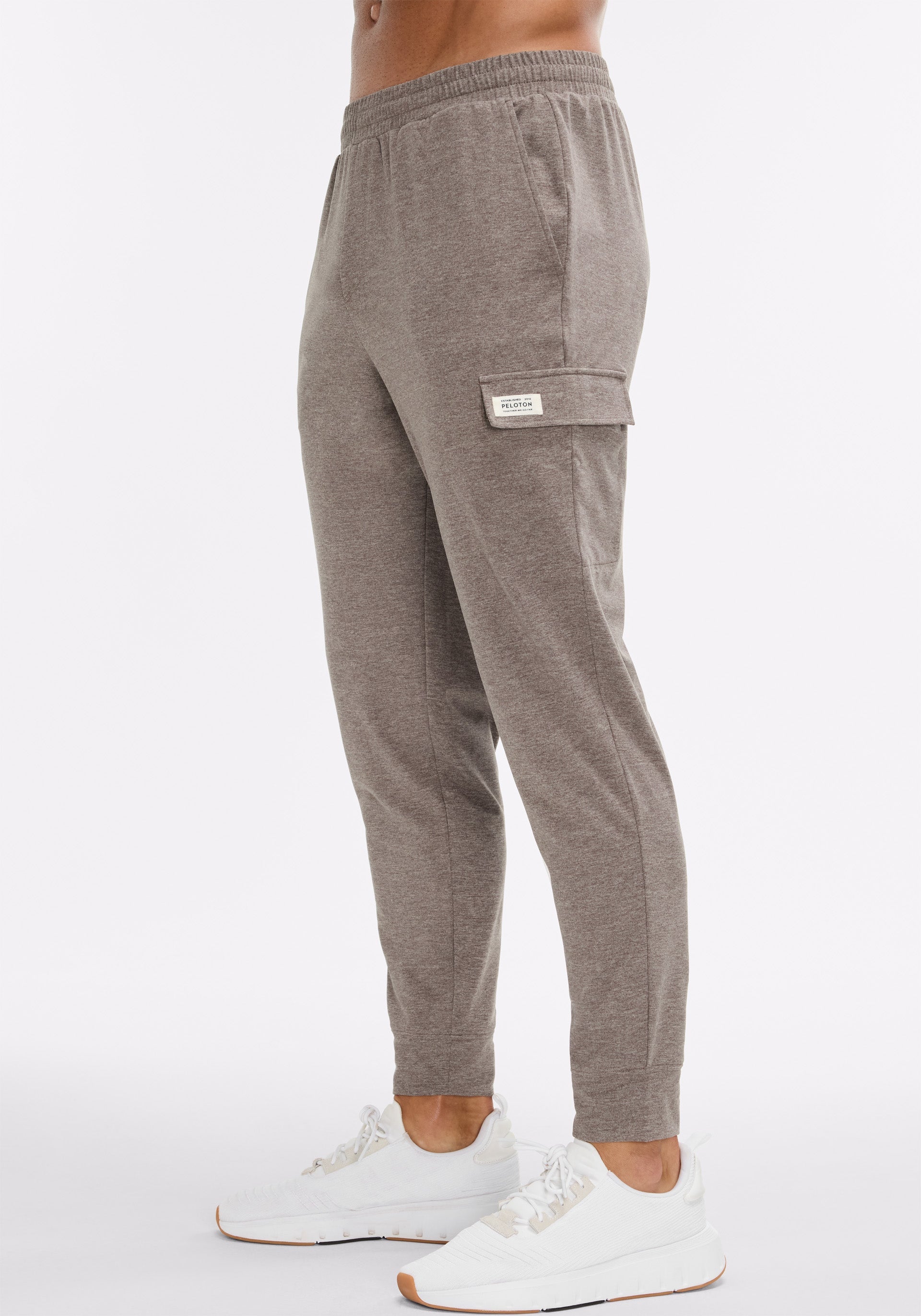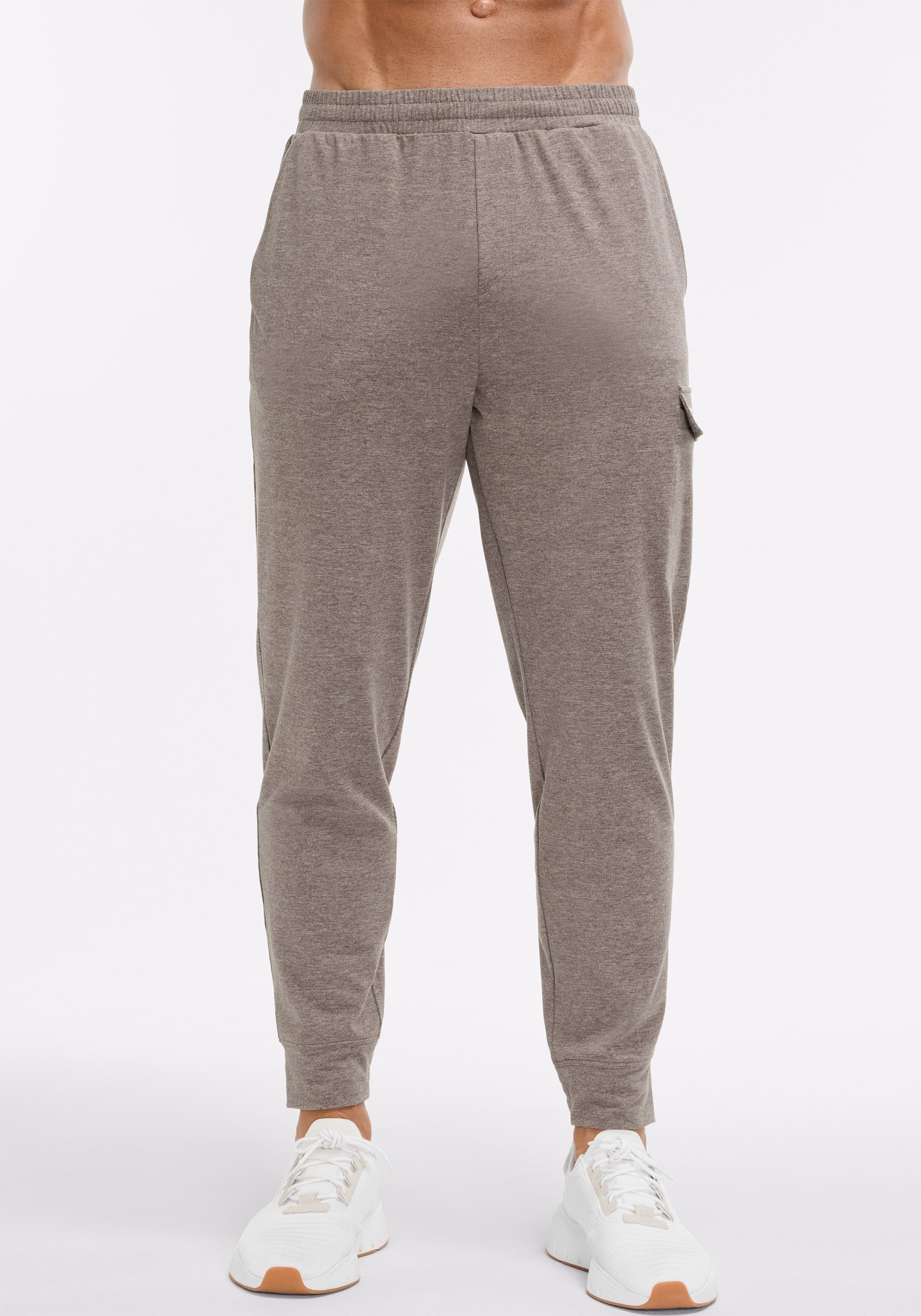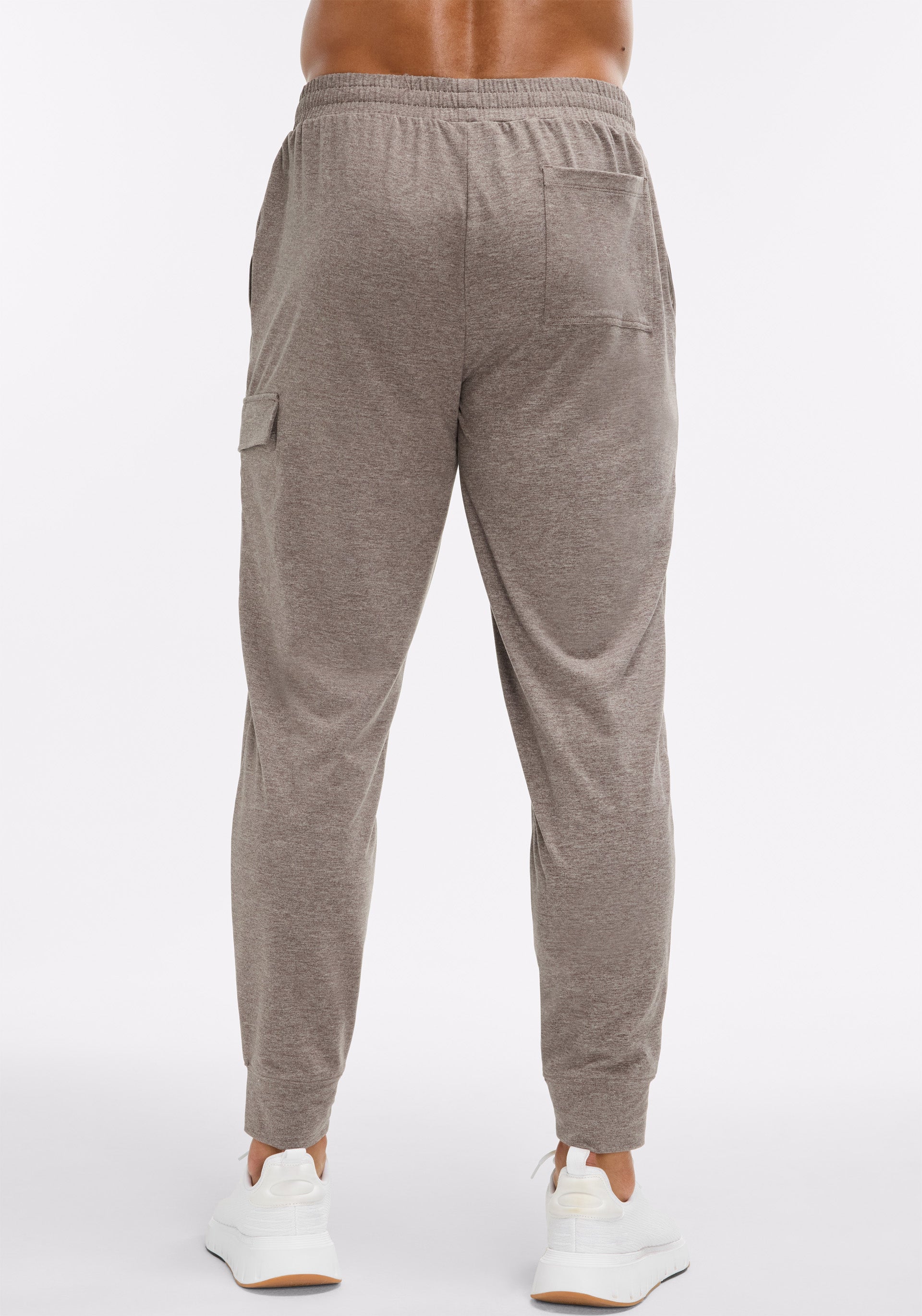 Classic jogger with side hand pockets, one cargo pocket, and elastic waistband with interior drawcord