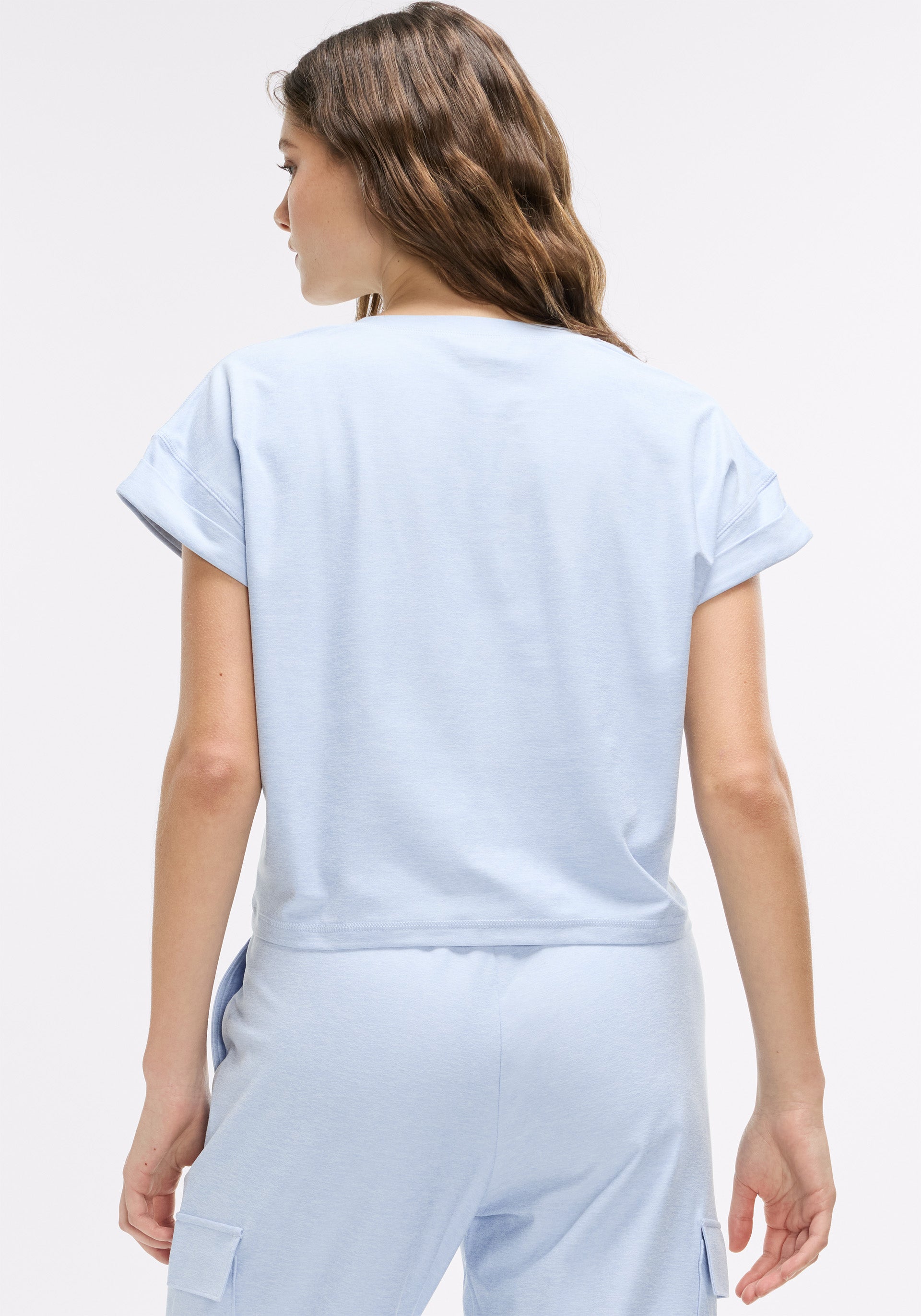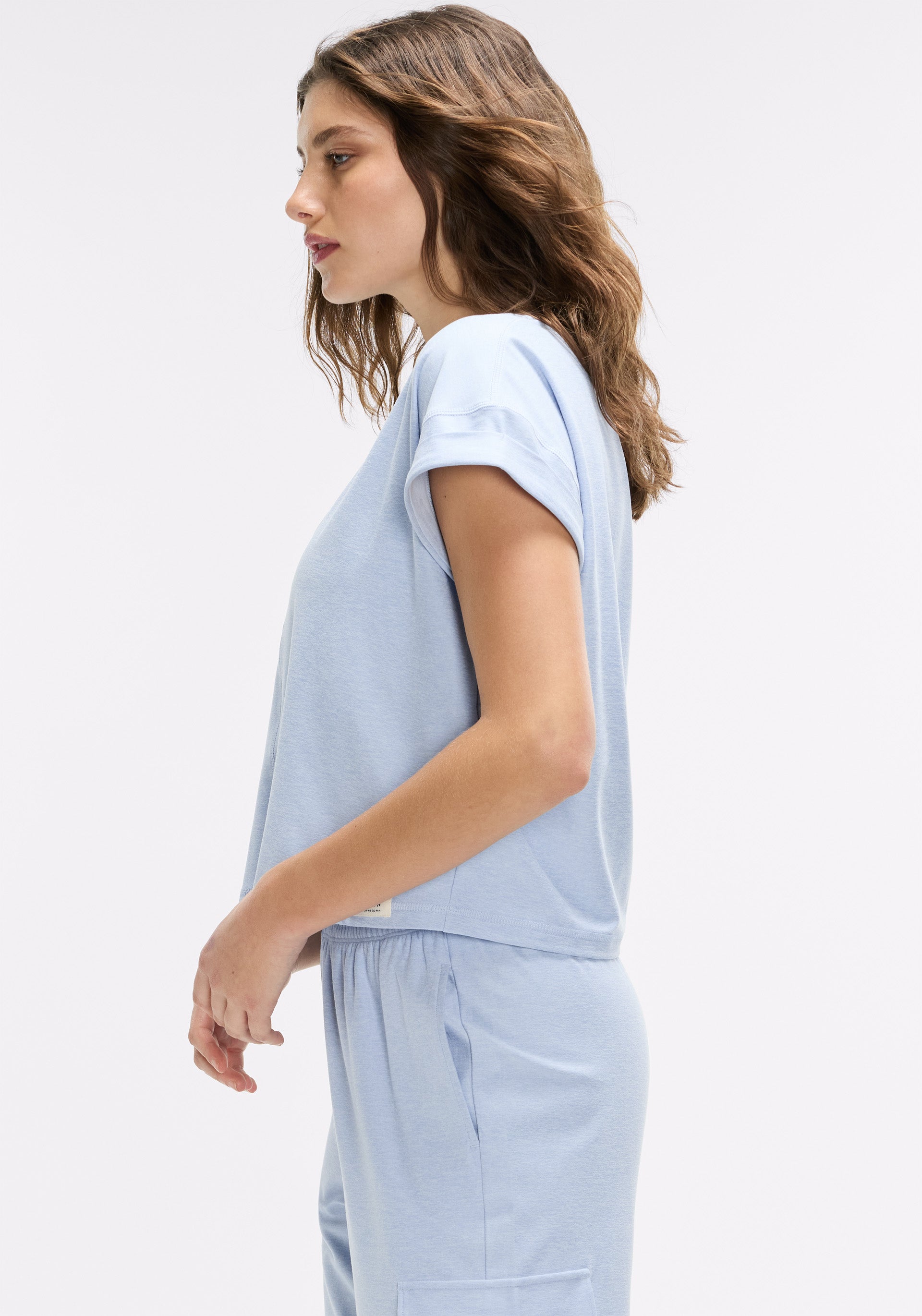 Deep v-neck, short sleeve with a meet and greet length and rolled sleeves