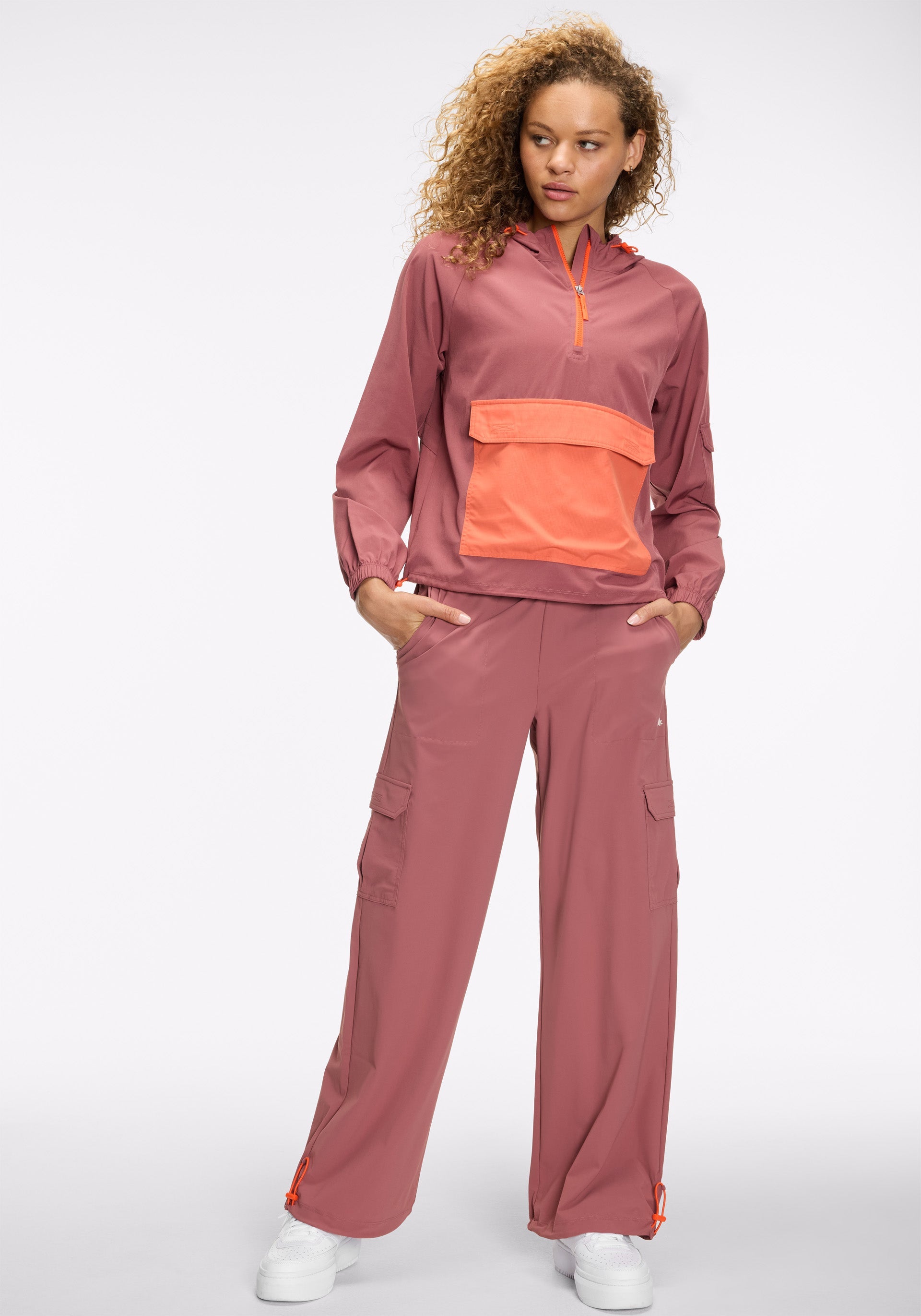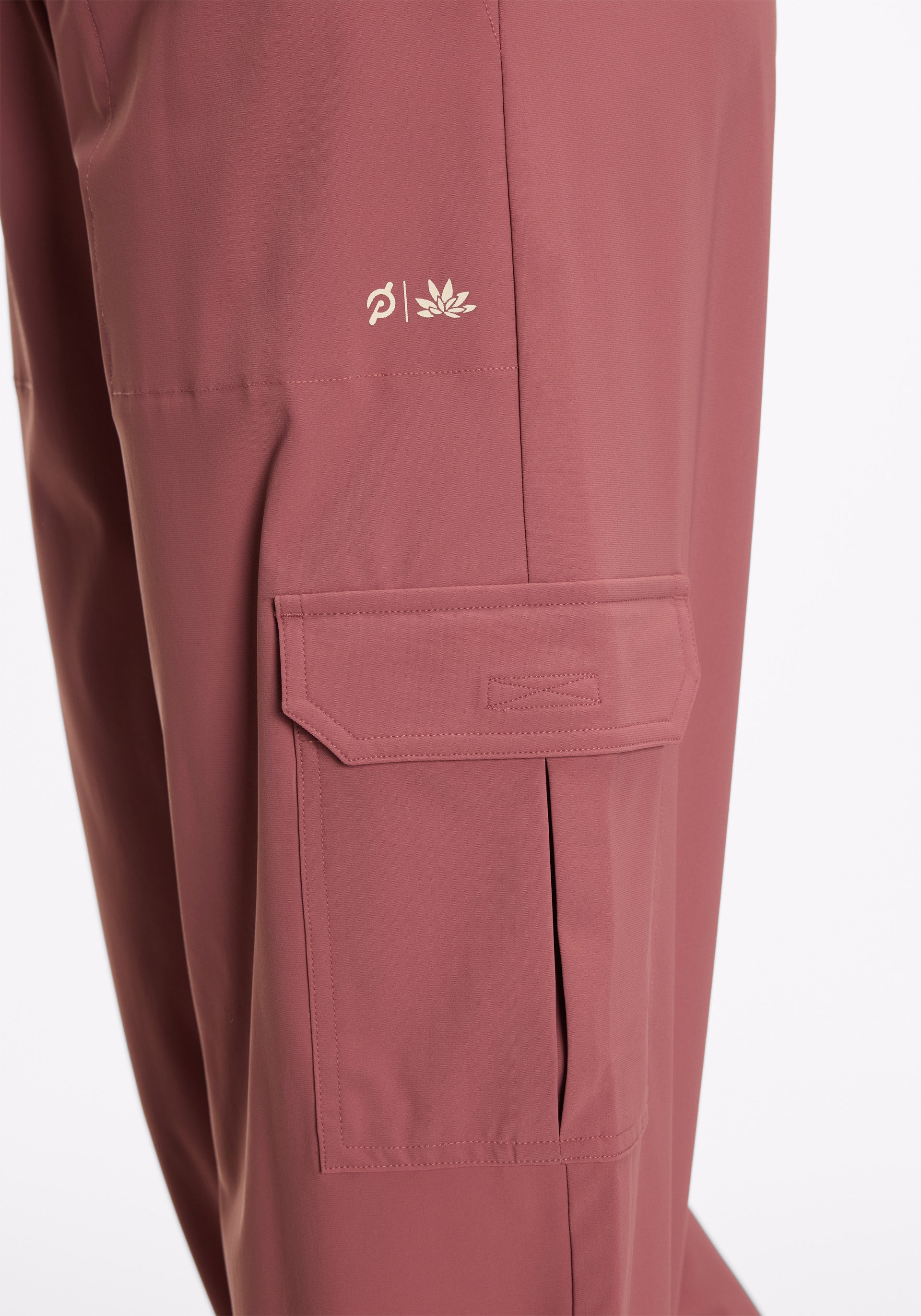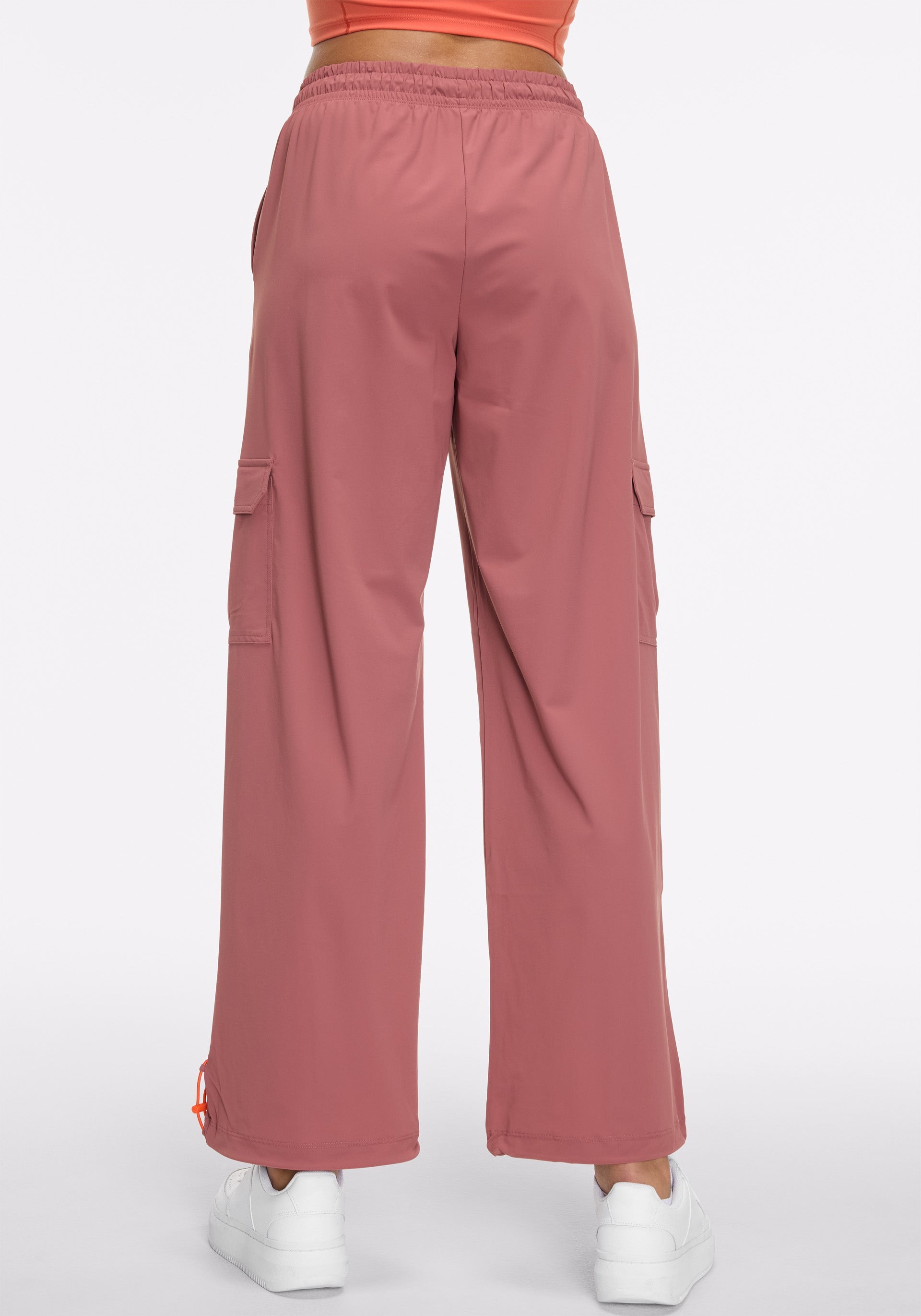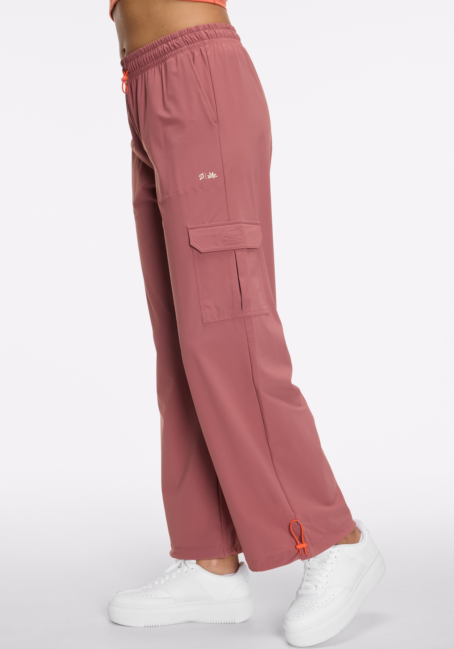 Cargo pant with encased elastic waistband, exterior bungee drawcord, hand pockets, velcro cargo pockets, and adjustable bungee cord at hem for a customizable look