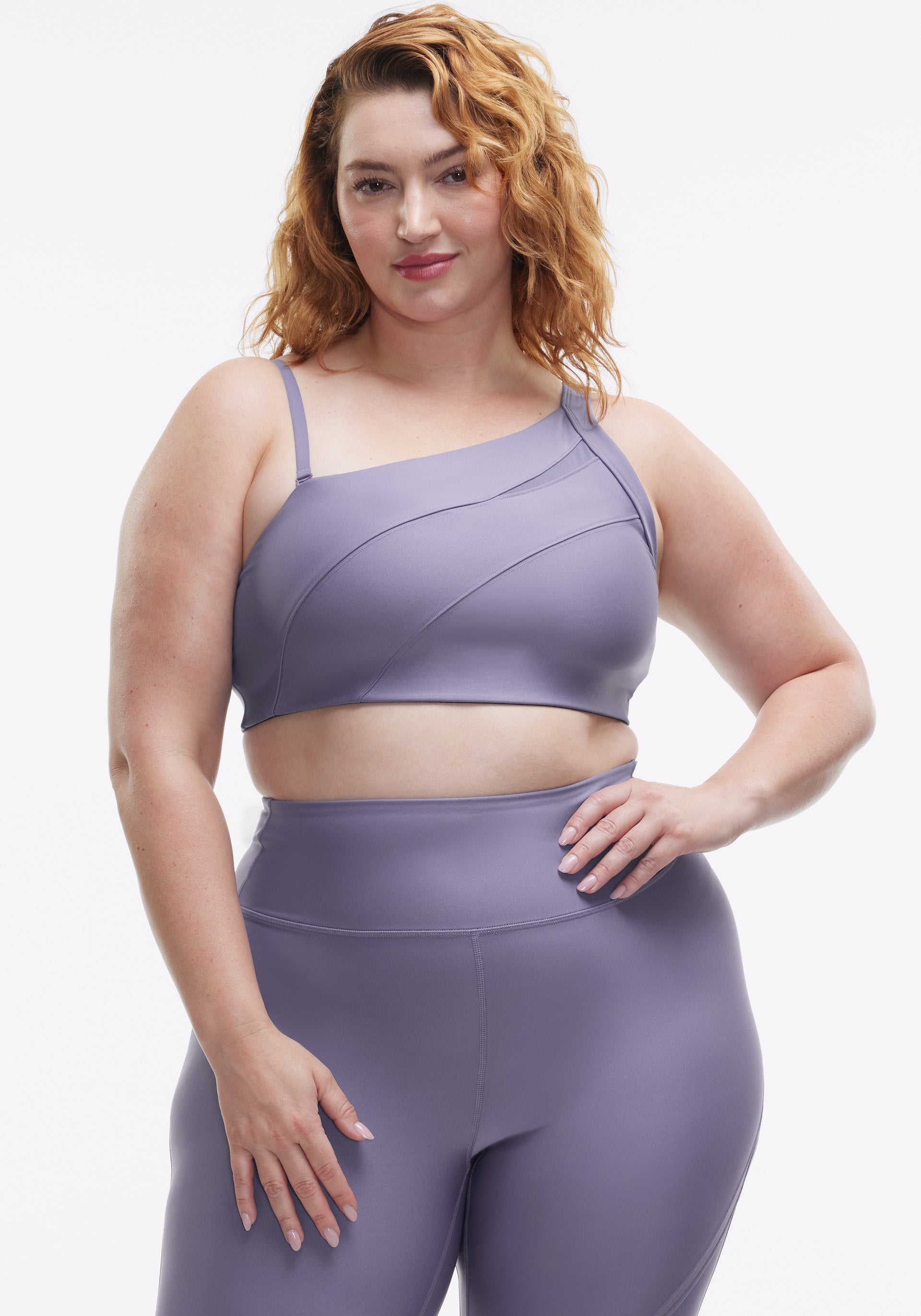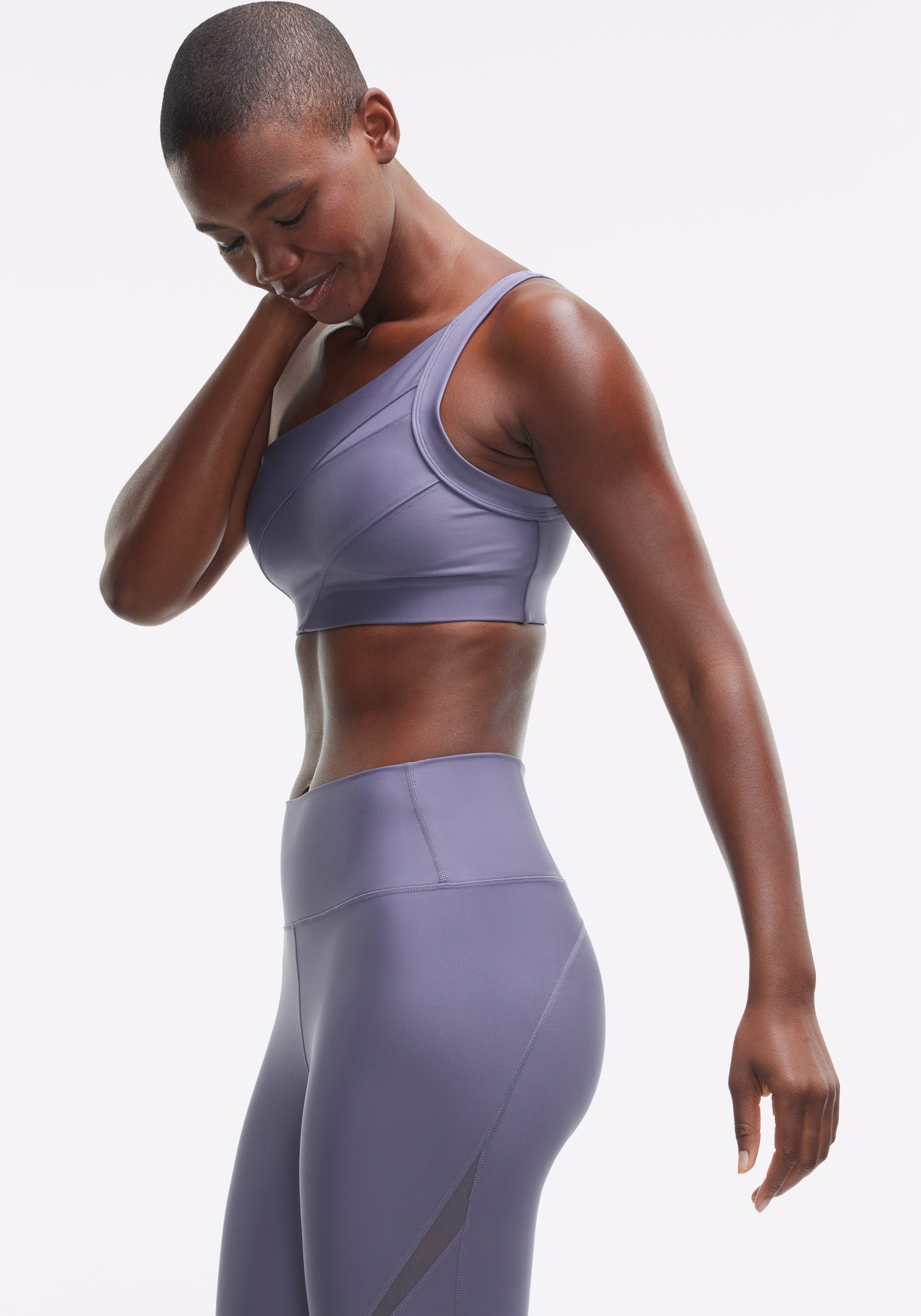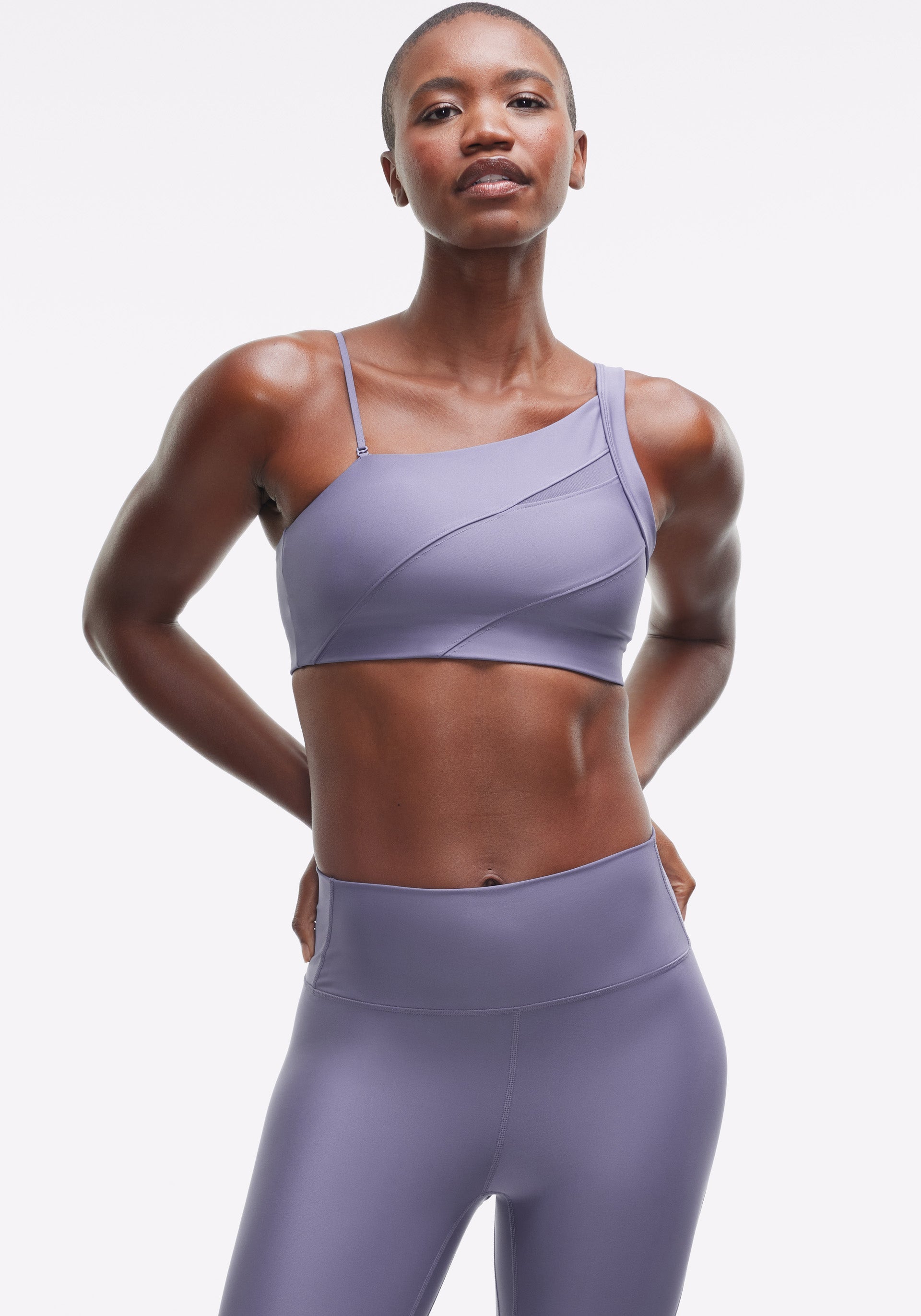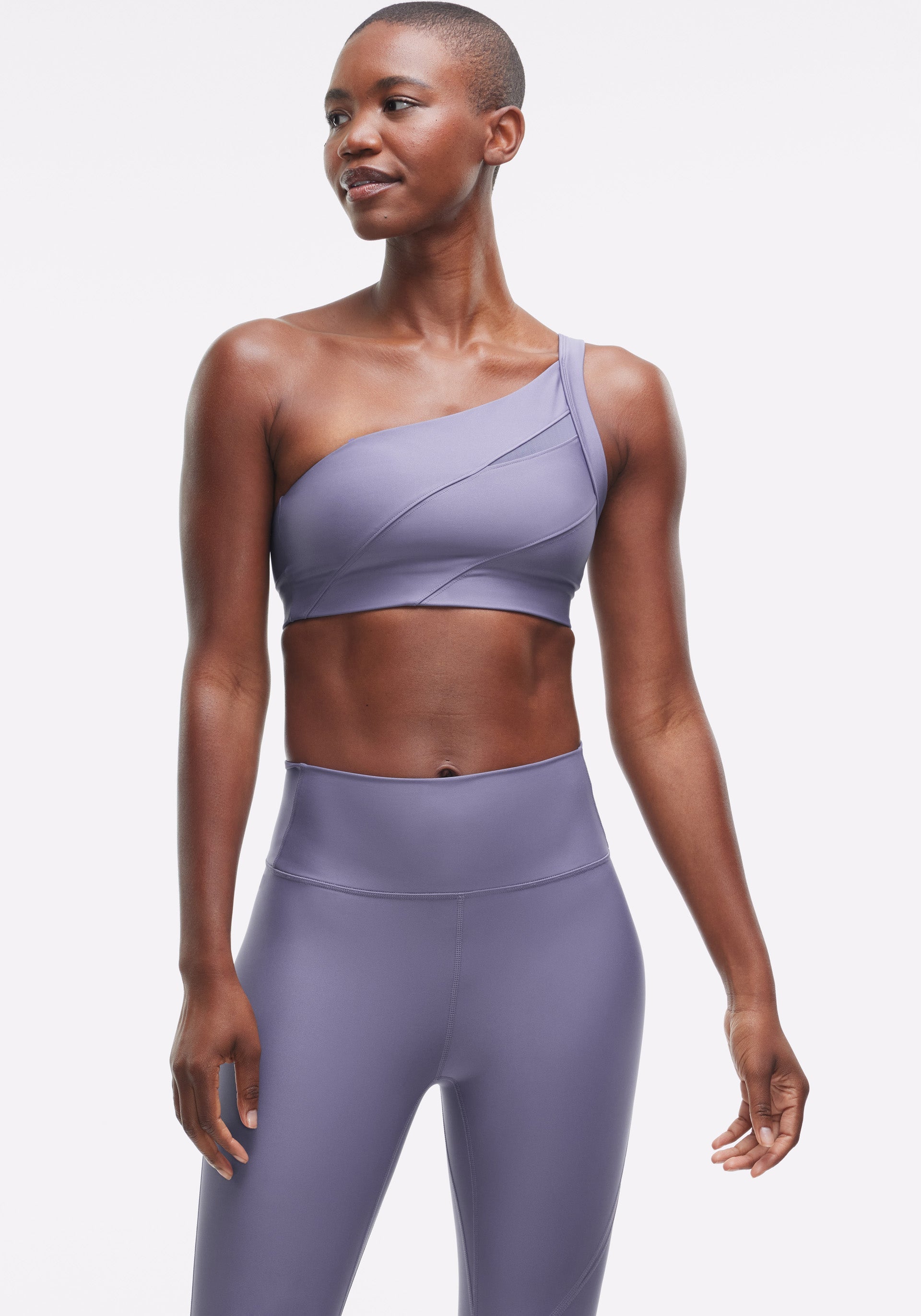 - One shoulder bra with mesh panel at front, removable strap, interior sweat channel encased elastic band, and removable cup pads