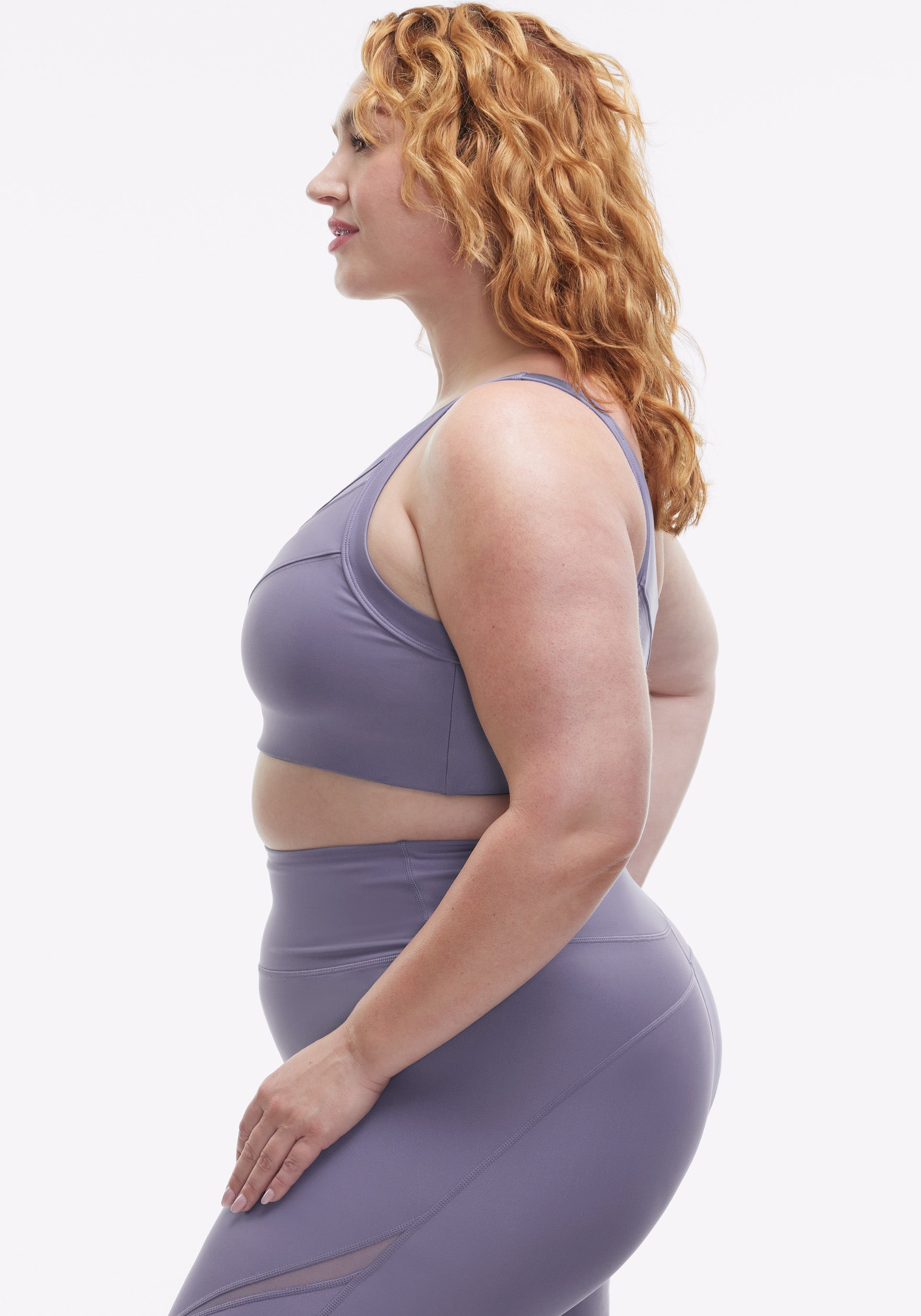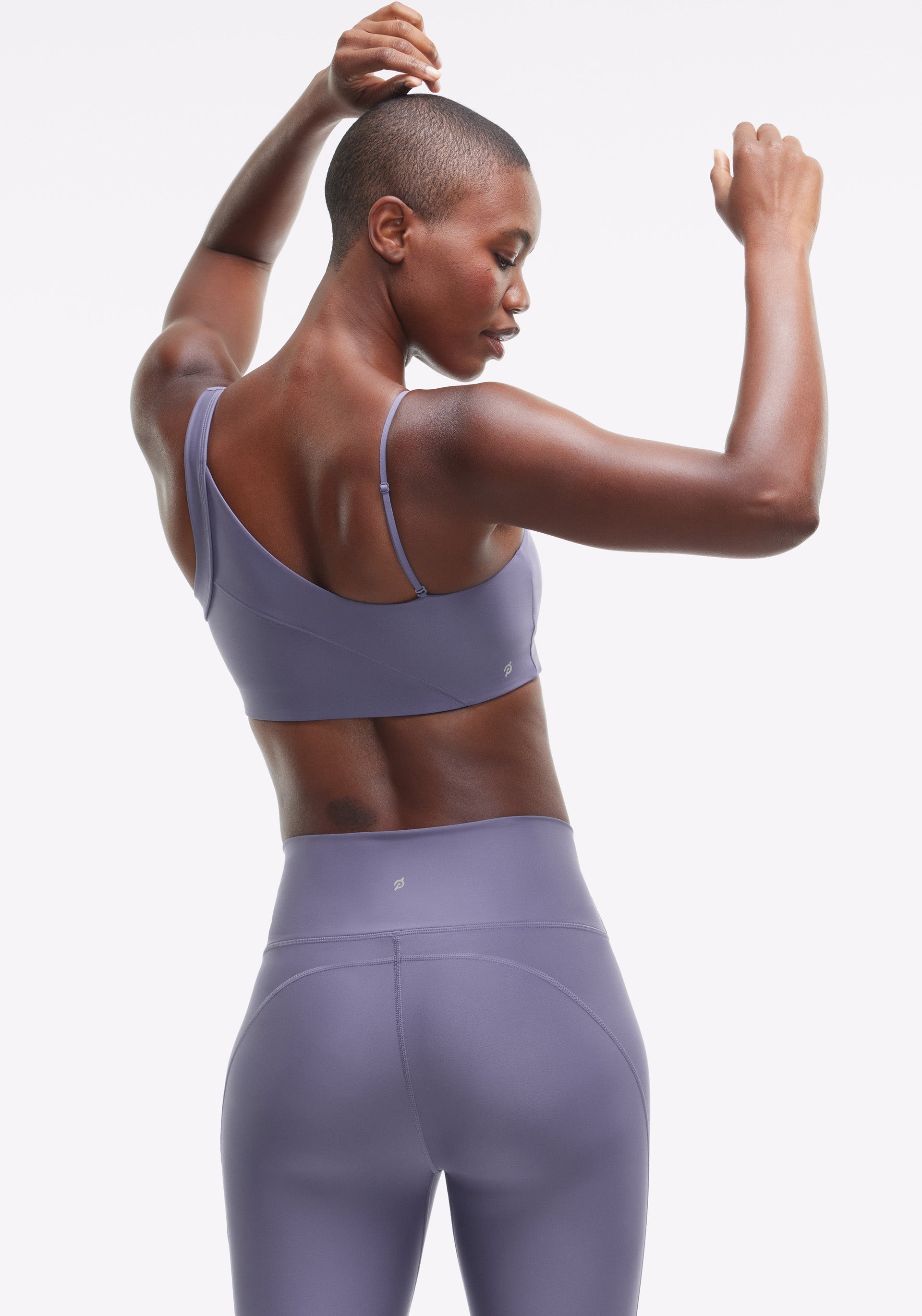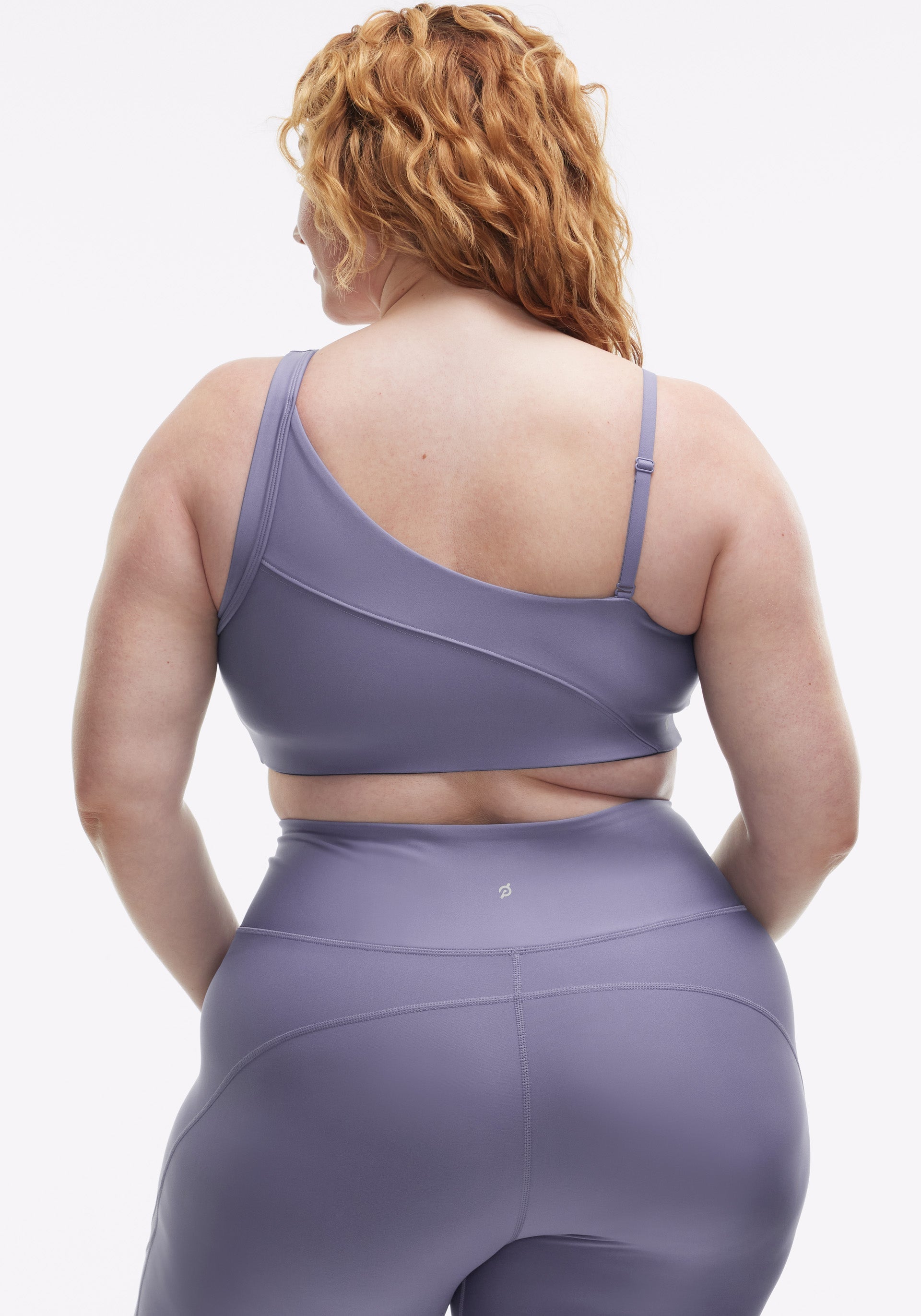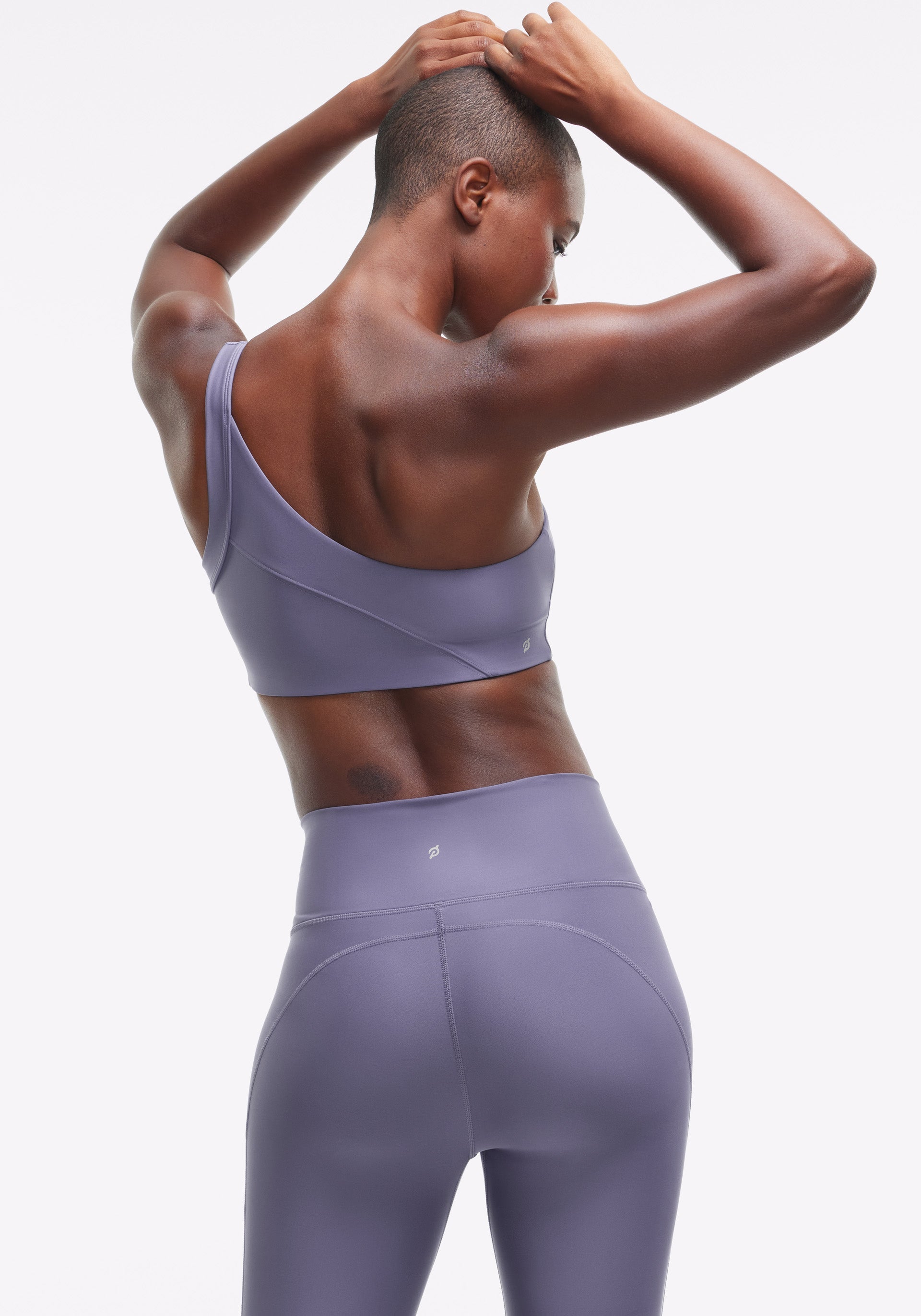 - One shoulder bra with mesh panel at front, removable strap, interior sweat channel encased elastic band, and removable cup pads