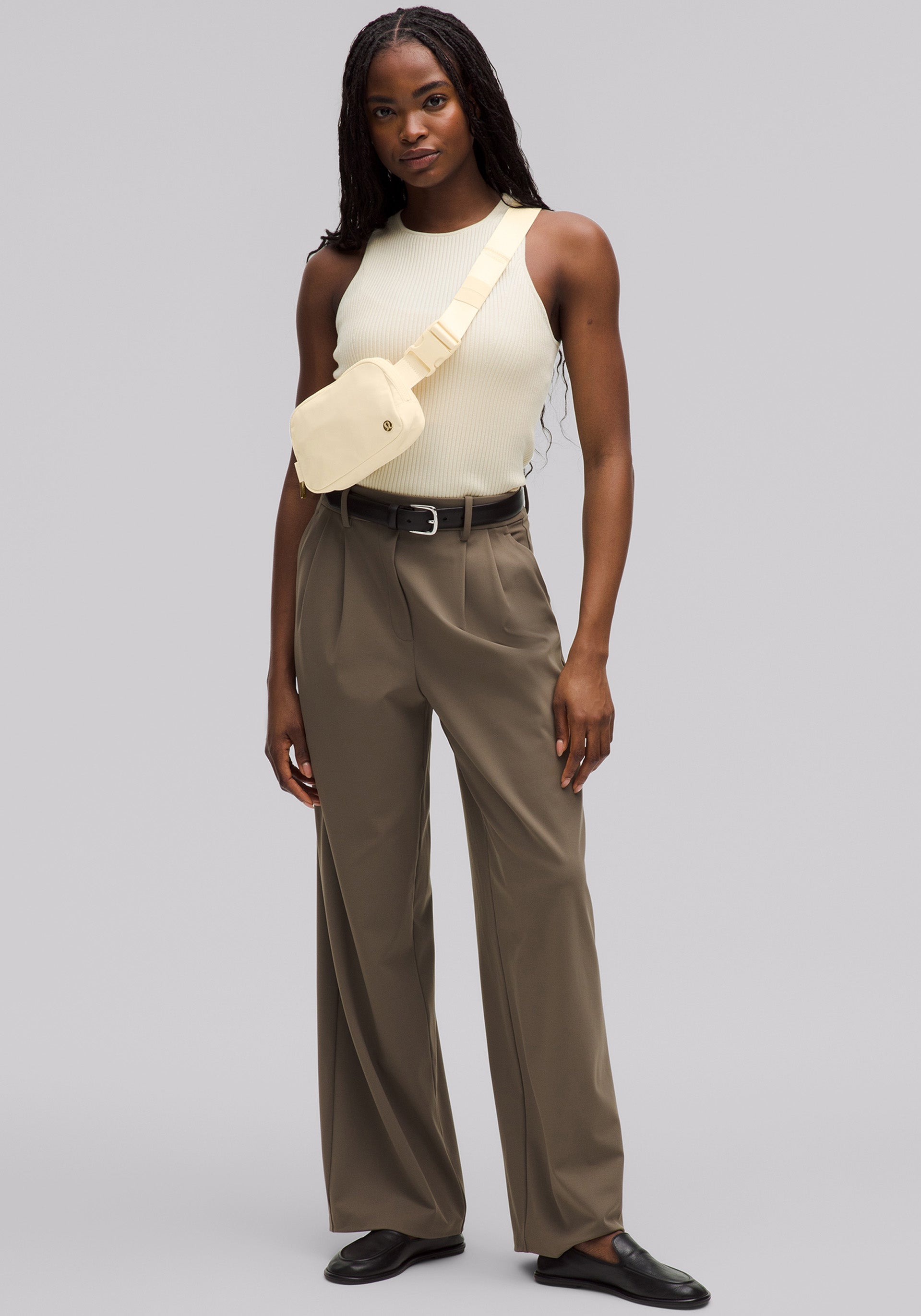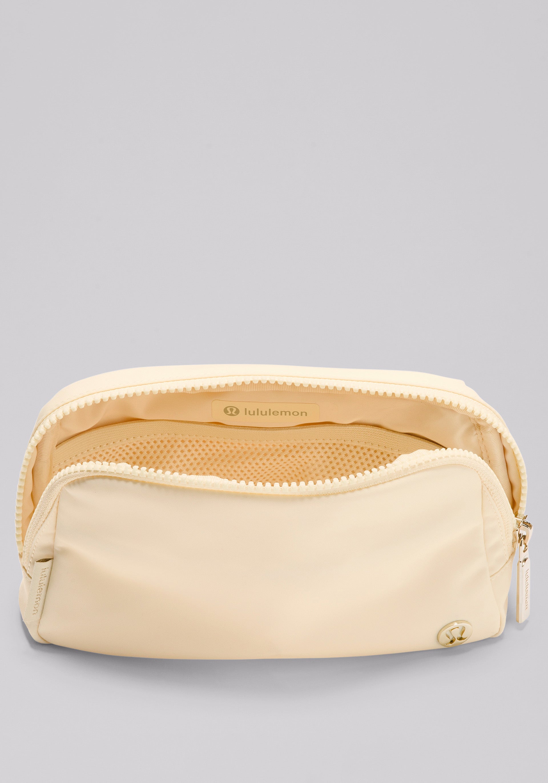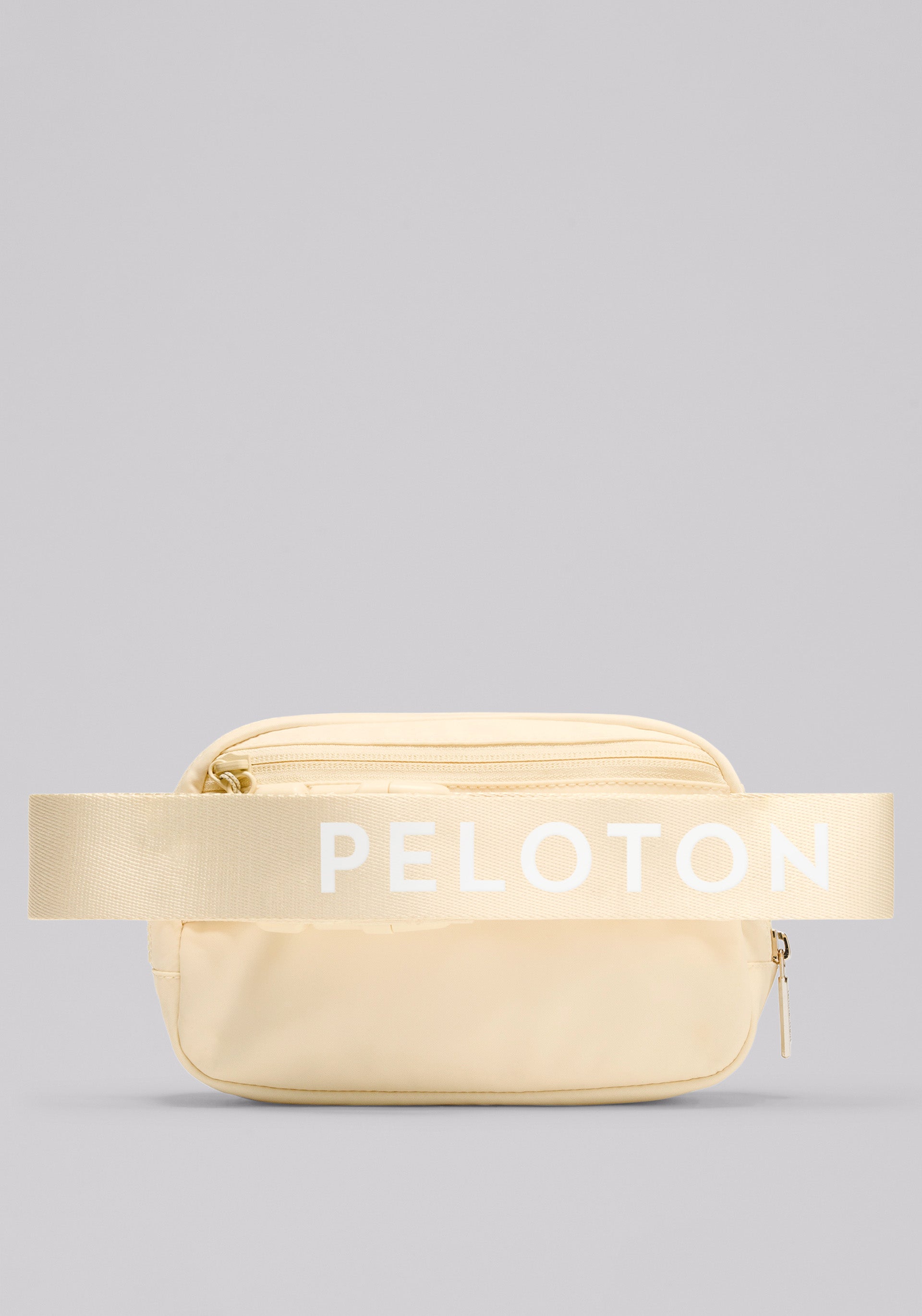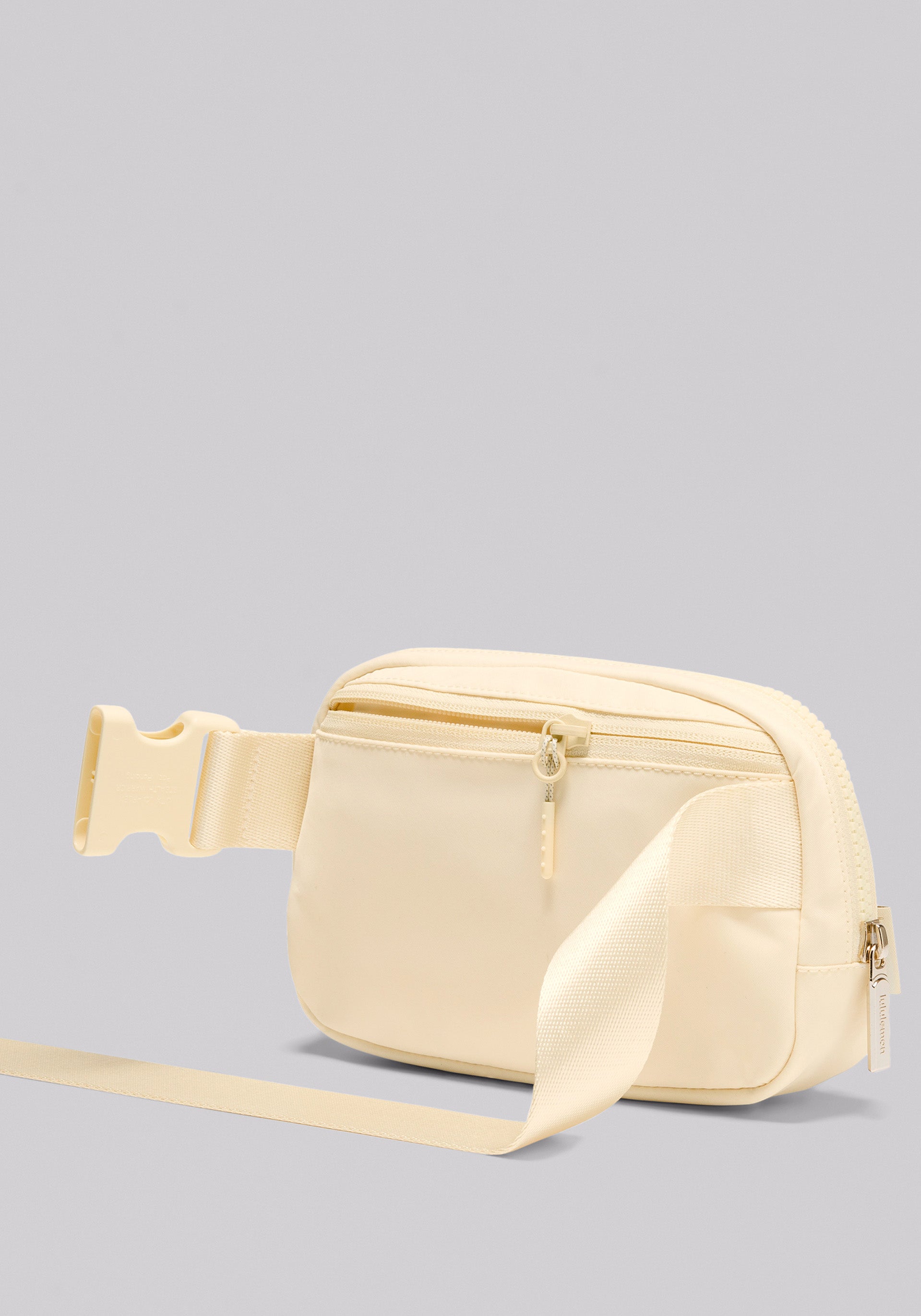 Belt bag with exterior zippered pocket to secure your valuables, interior pockets hold the essentials and elastic loops to tuck excess bag strap into