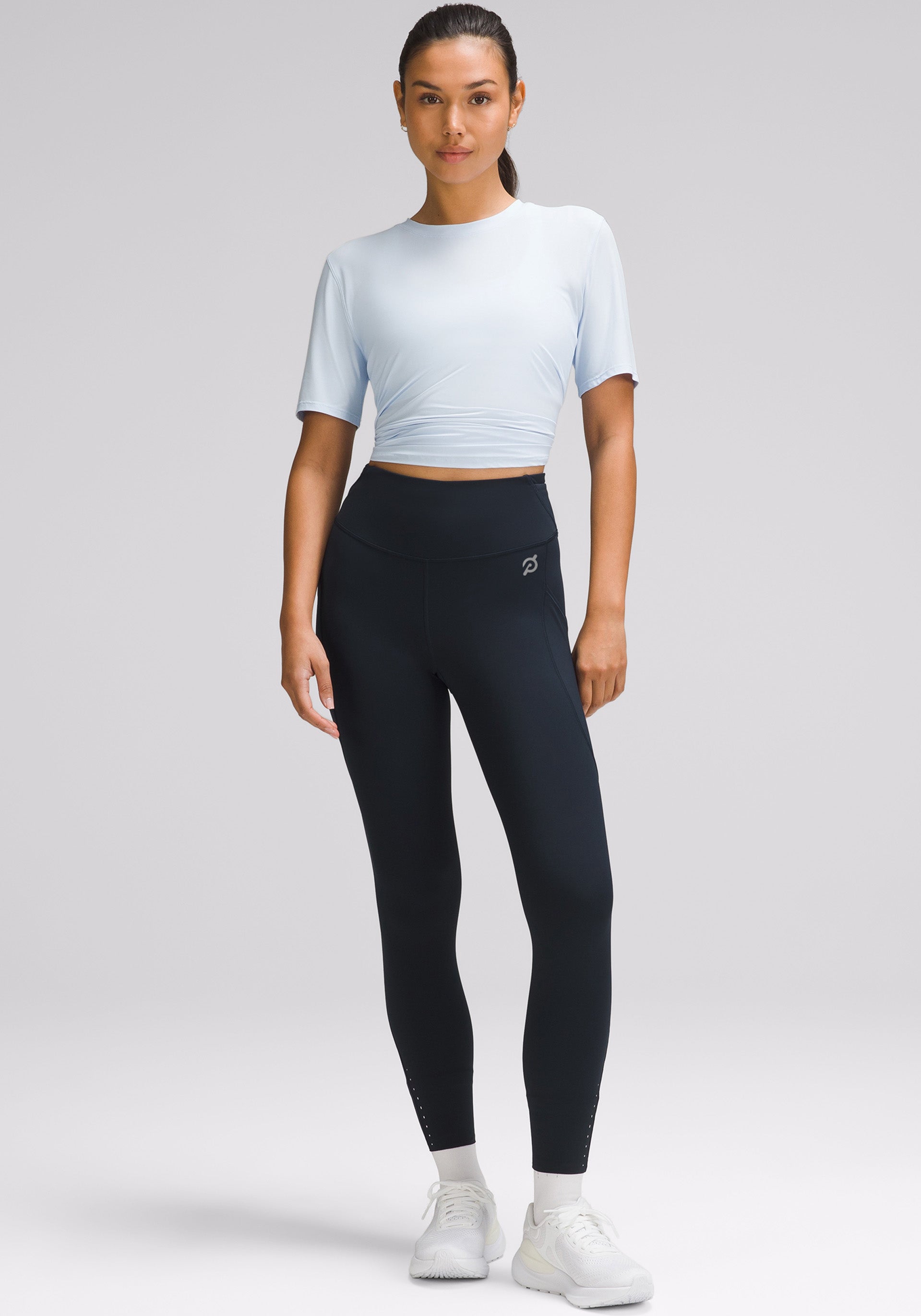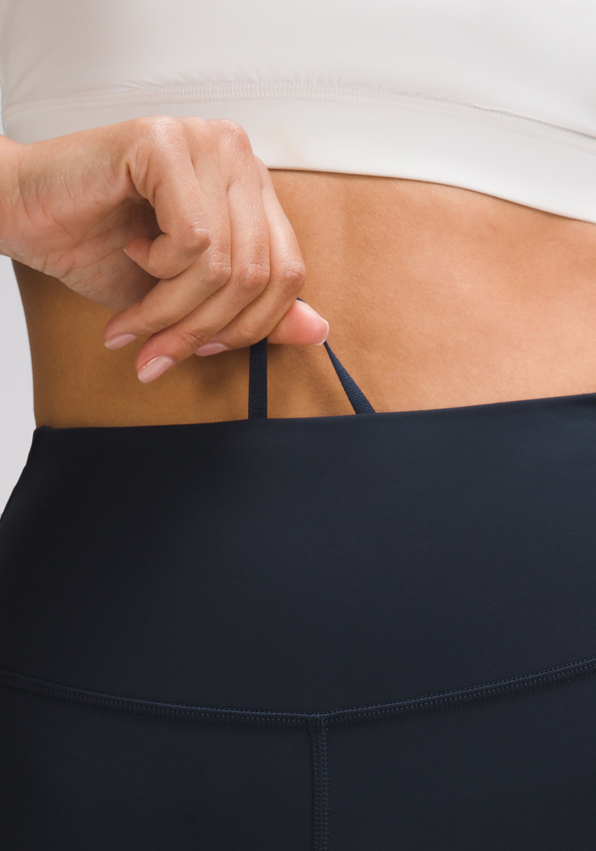 - High Rise, 25” inseam legging with waistband drawcord to keep your leggings in place as well as three waistband pockets and two side drop-in pockets to secure all the essentials