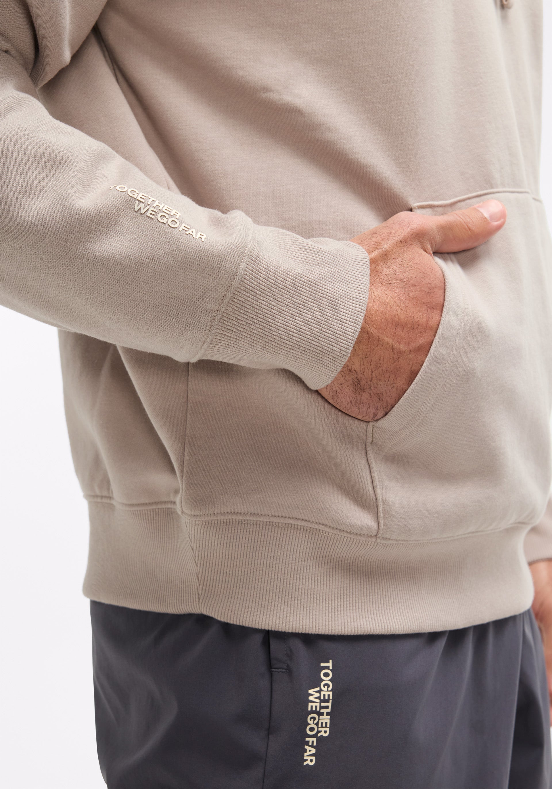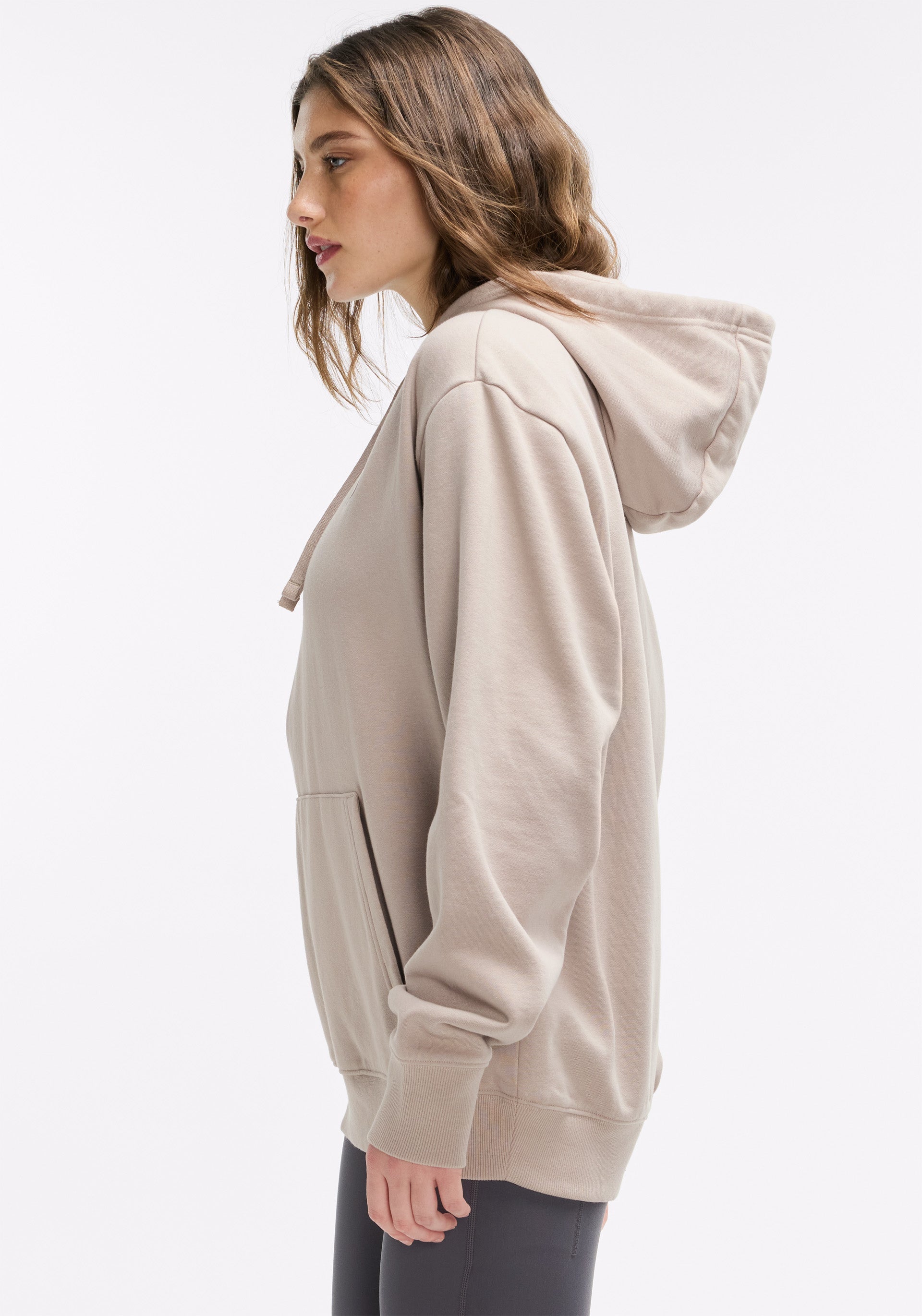 Gender neutral, cotton fleece sweatshirt with an exaggerated hood and kangaroo pocket detail