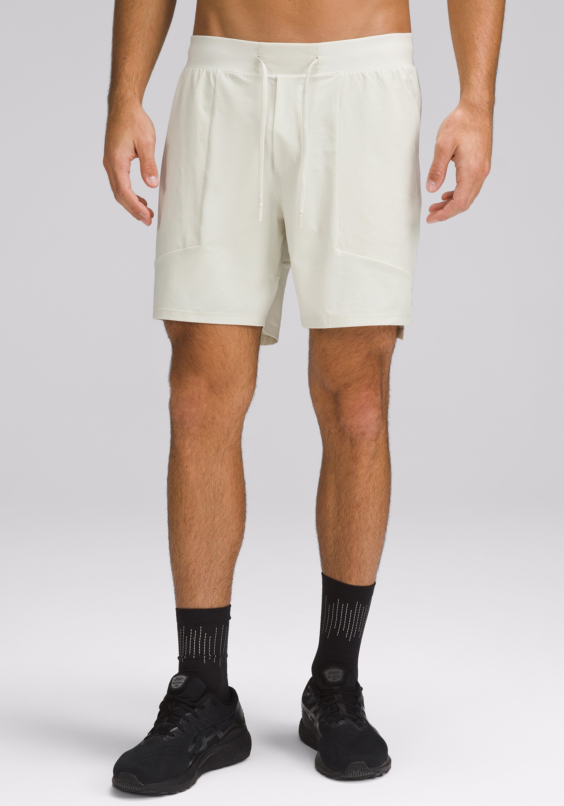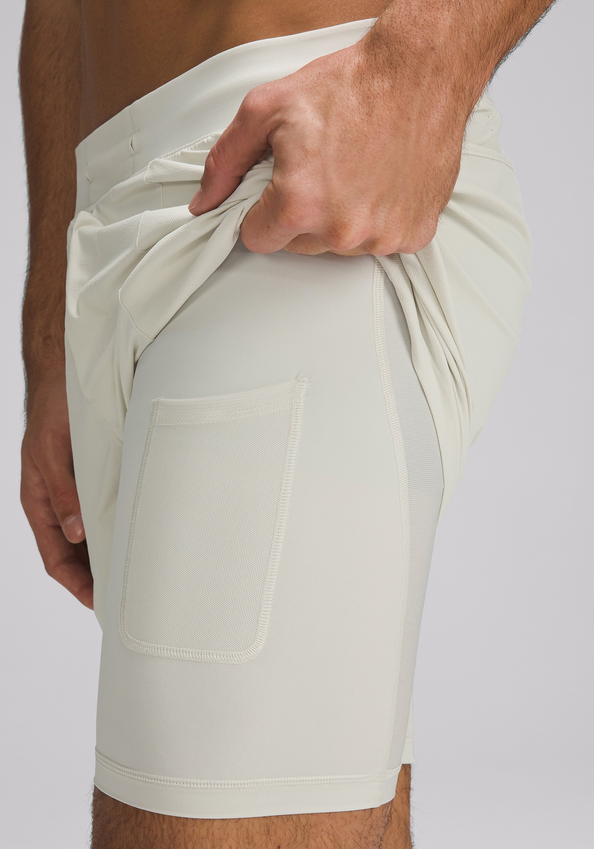 7” inseam, lined performance short with waistband drawcord that can be worn inside or out and zippered hand pockets with hidden phone and coin sleeves