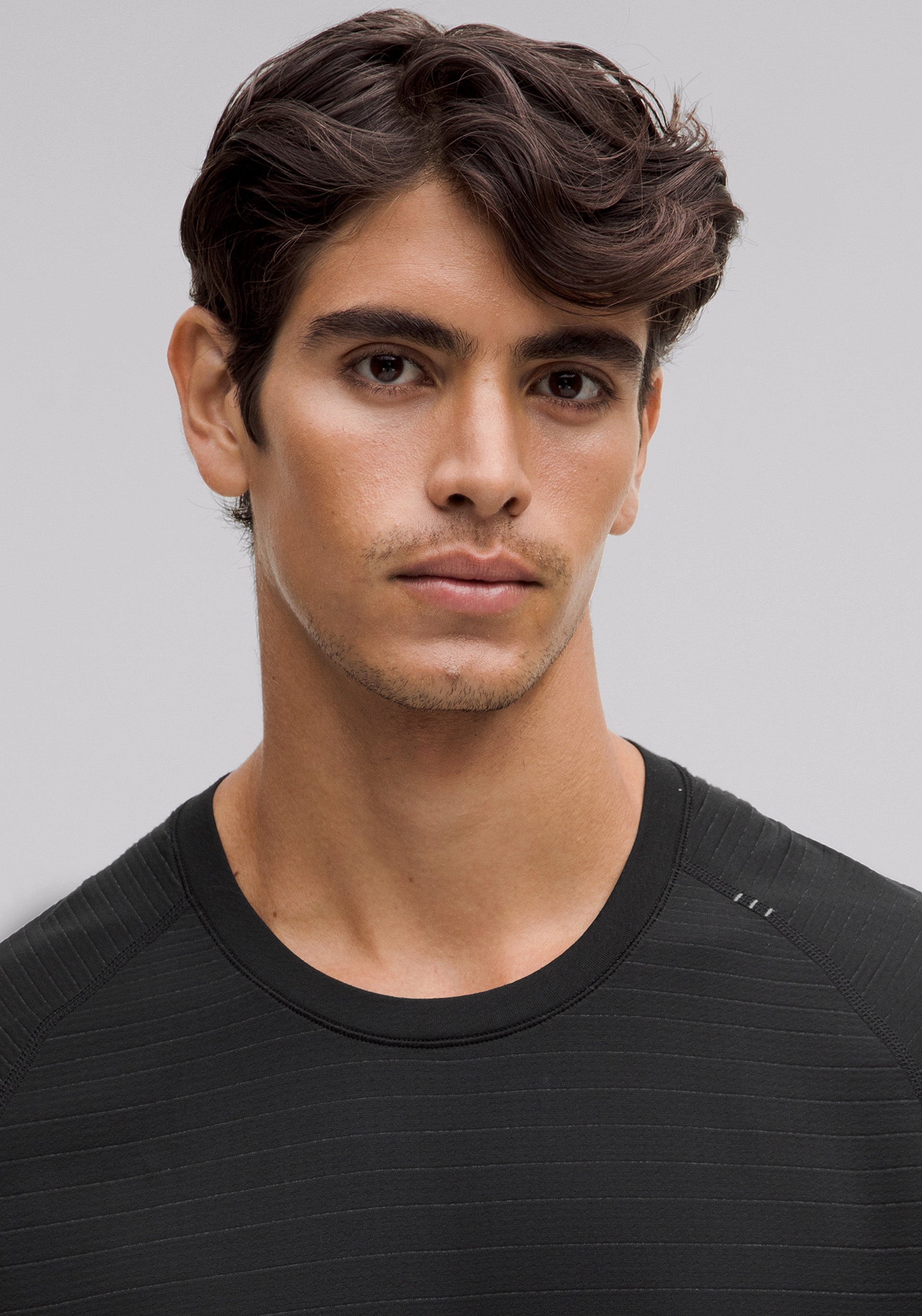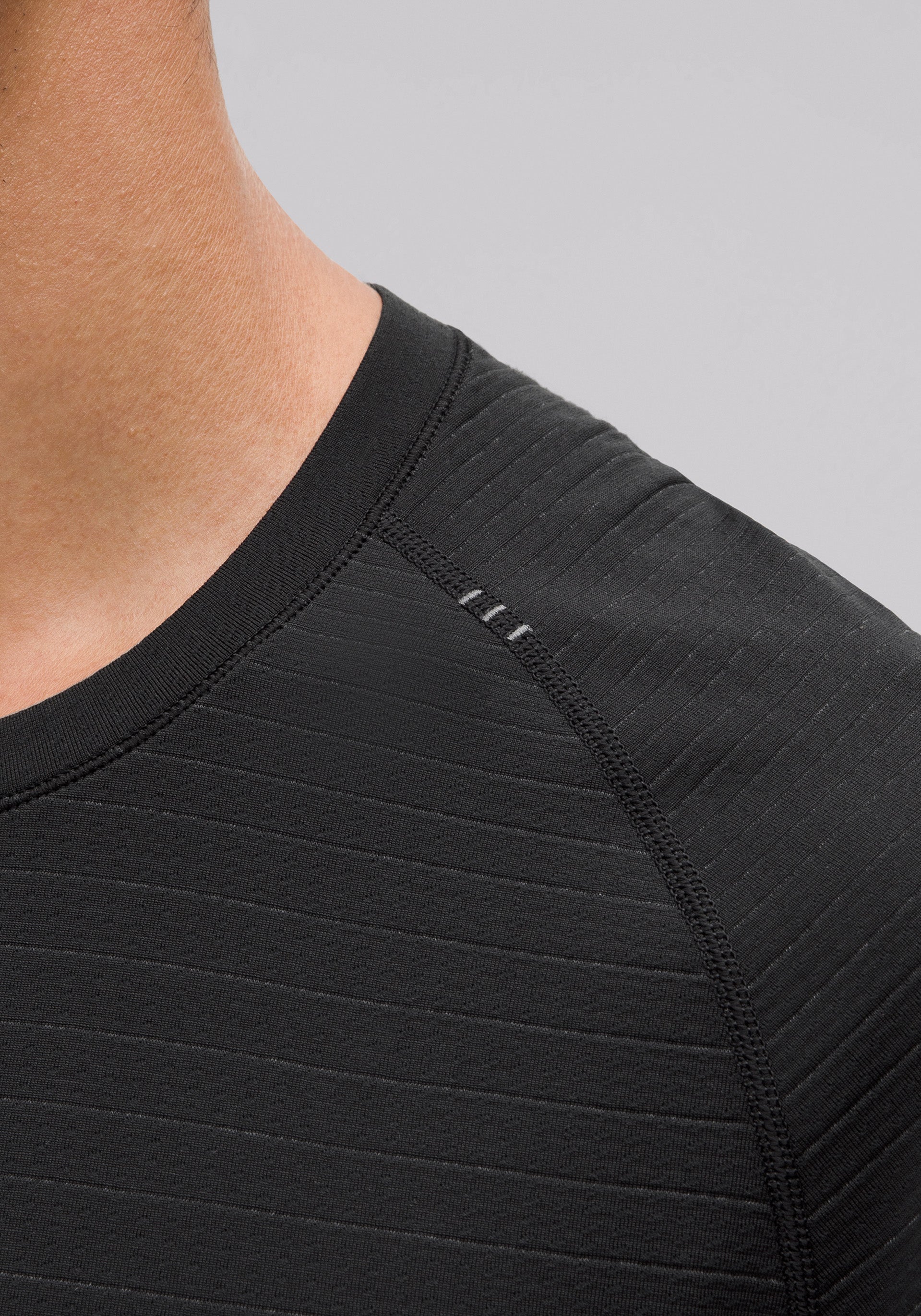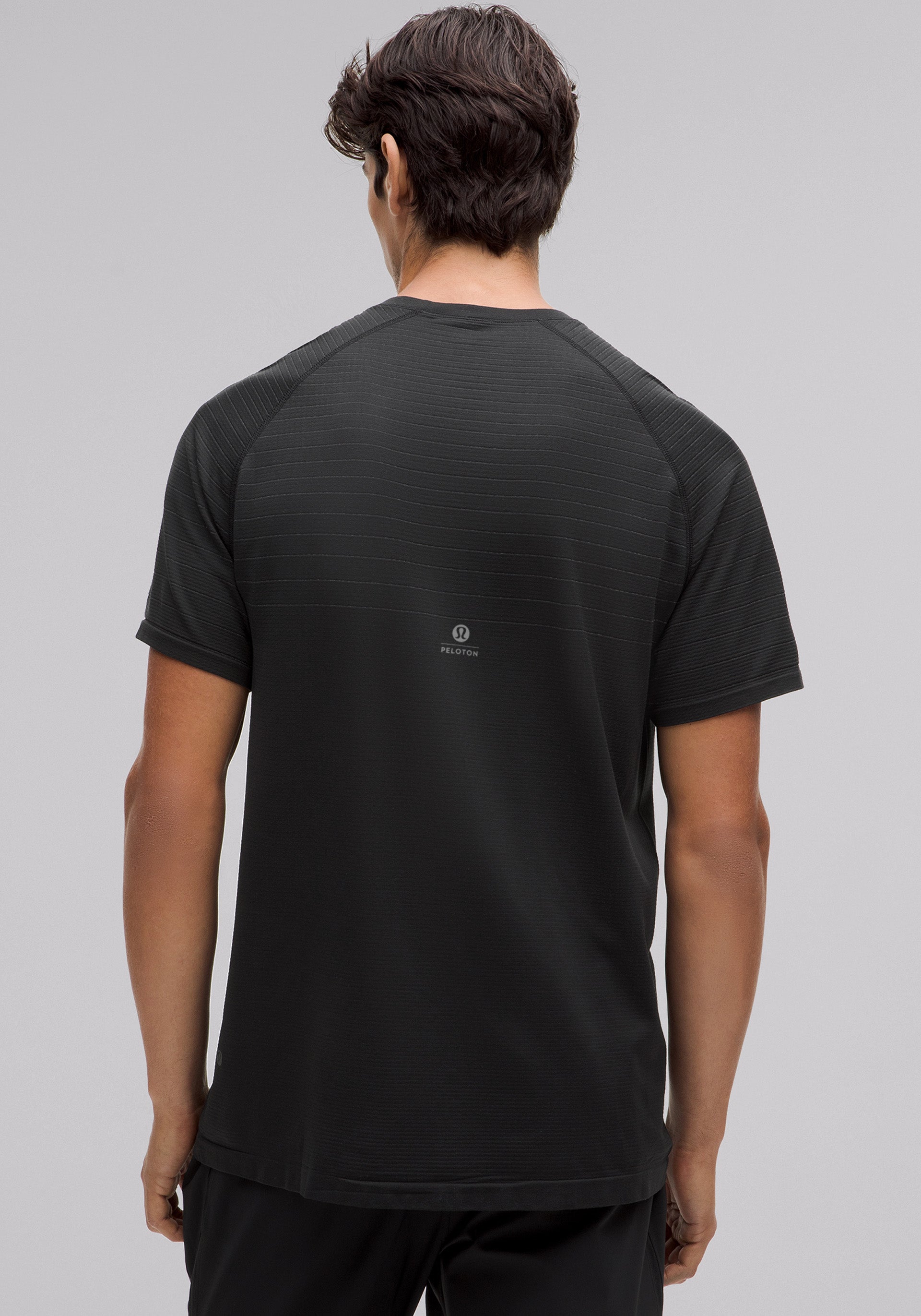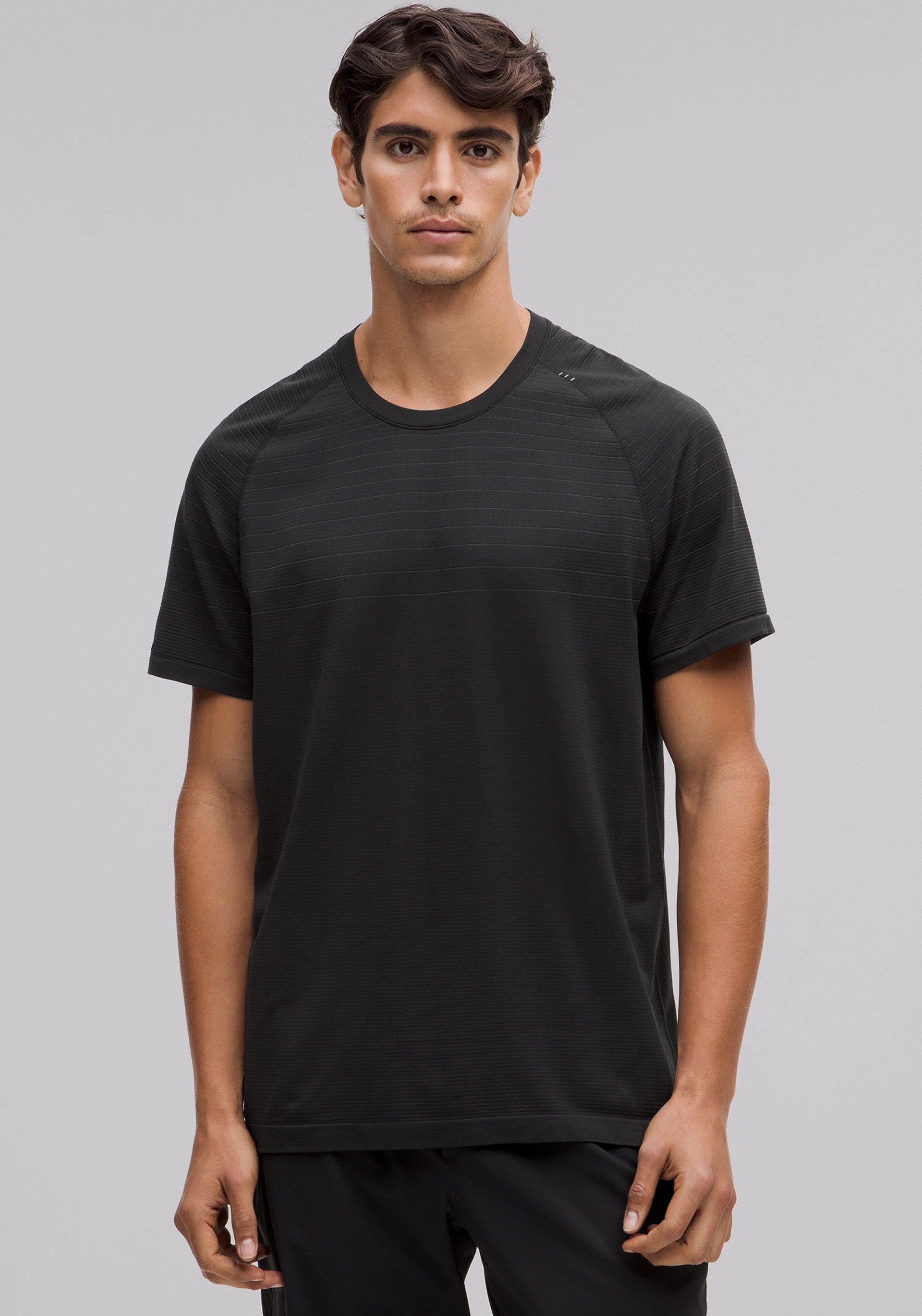 Crewneck, short sleeve with no side seams so you can skip the chafe and a rebalanced fabric and fit for less cling on sweaty skin
