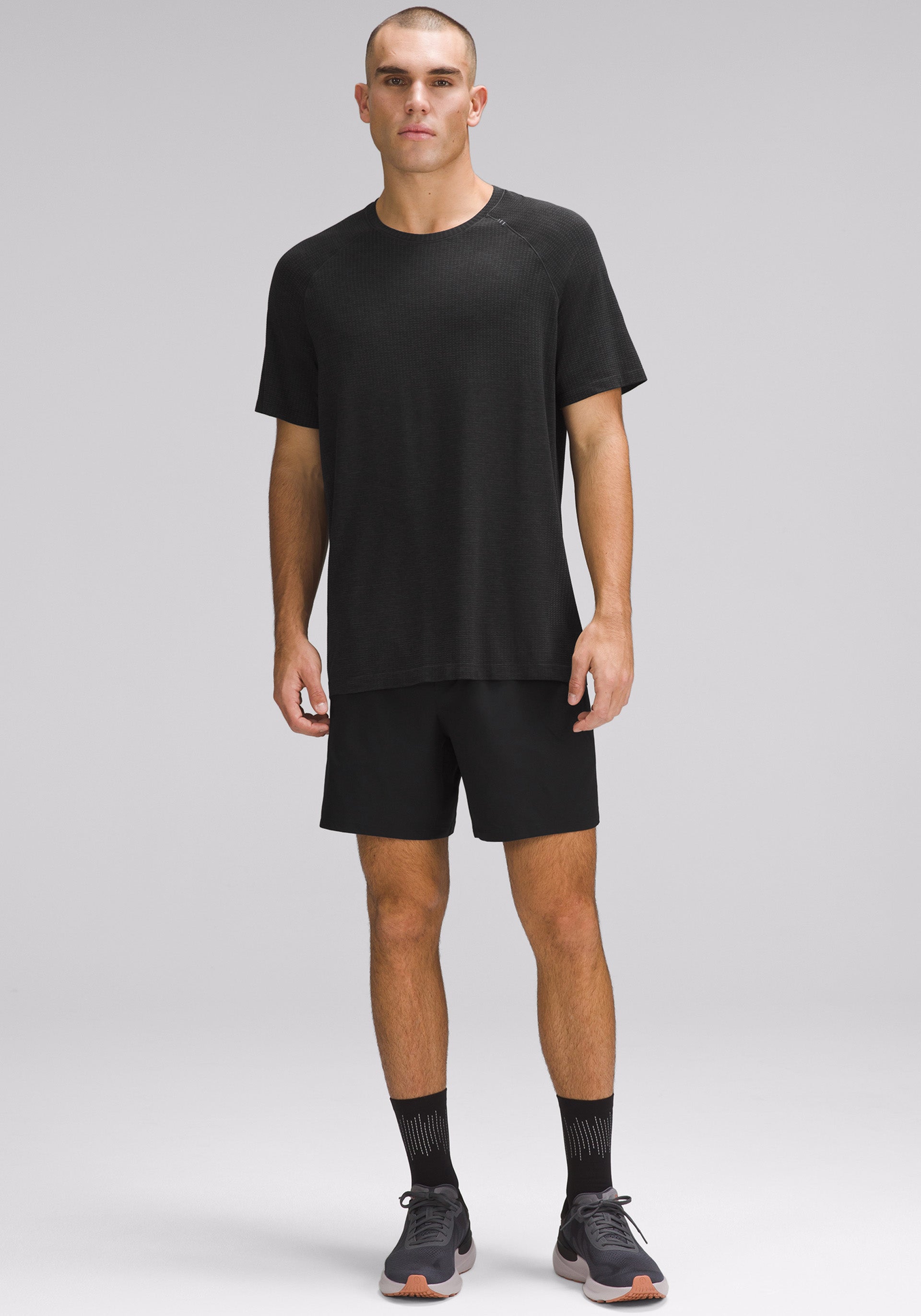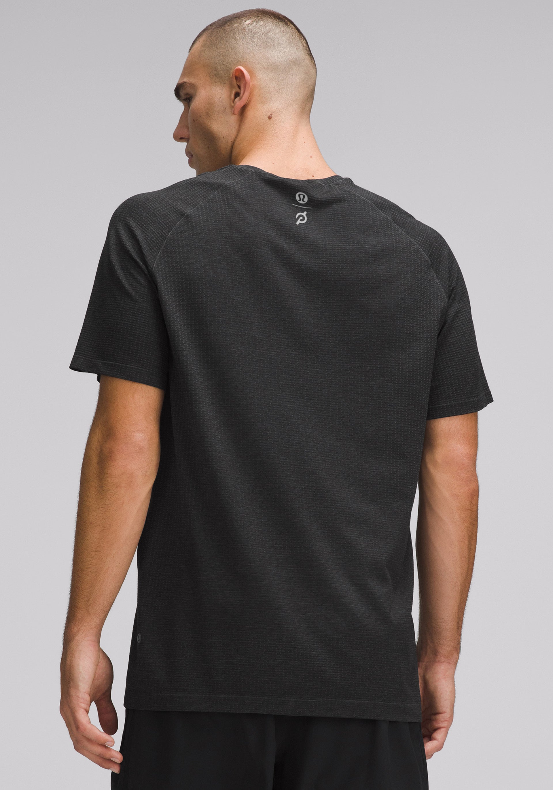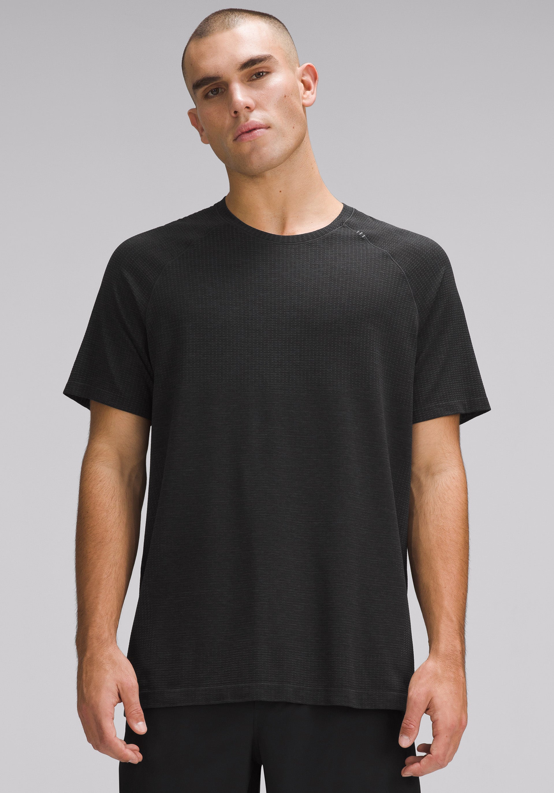 Crewneck, short sleeve with no side seams so you can skip the chafe and a rebalanced fabric and fit for less cling on sweaty skin