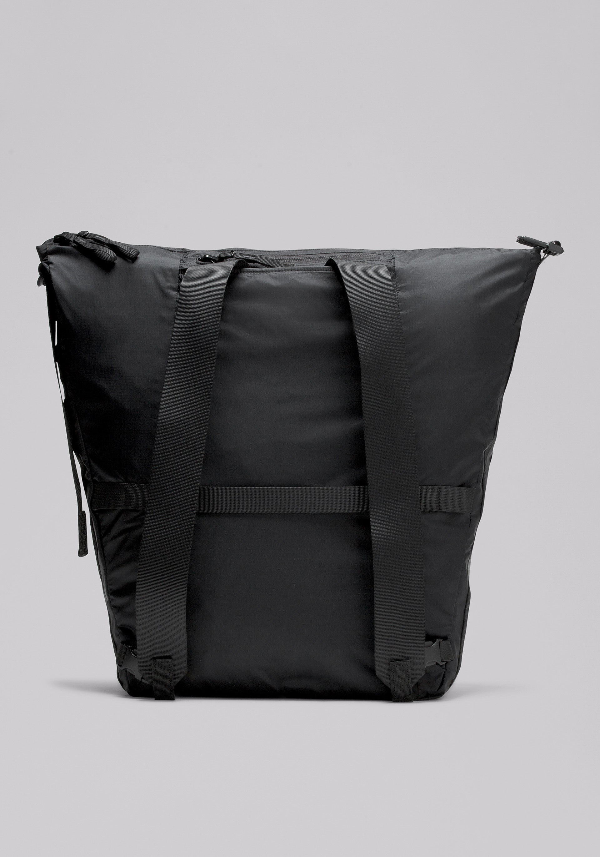 Convertible bag doubling as a tote or backpack with zippered main compartment, exterior zippered pocket, and packable into smaller pouch with buckle closure