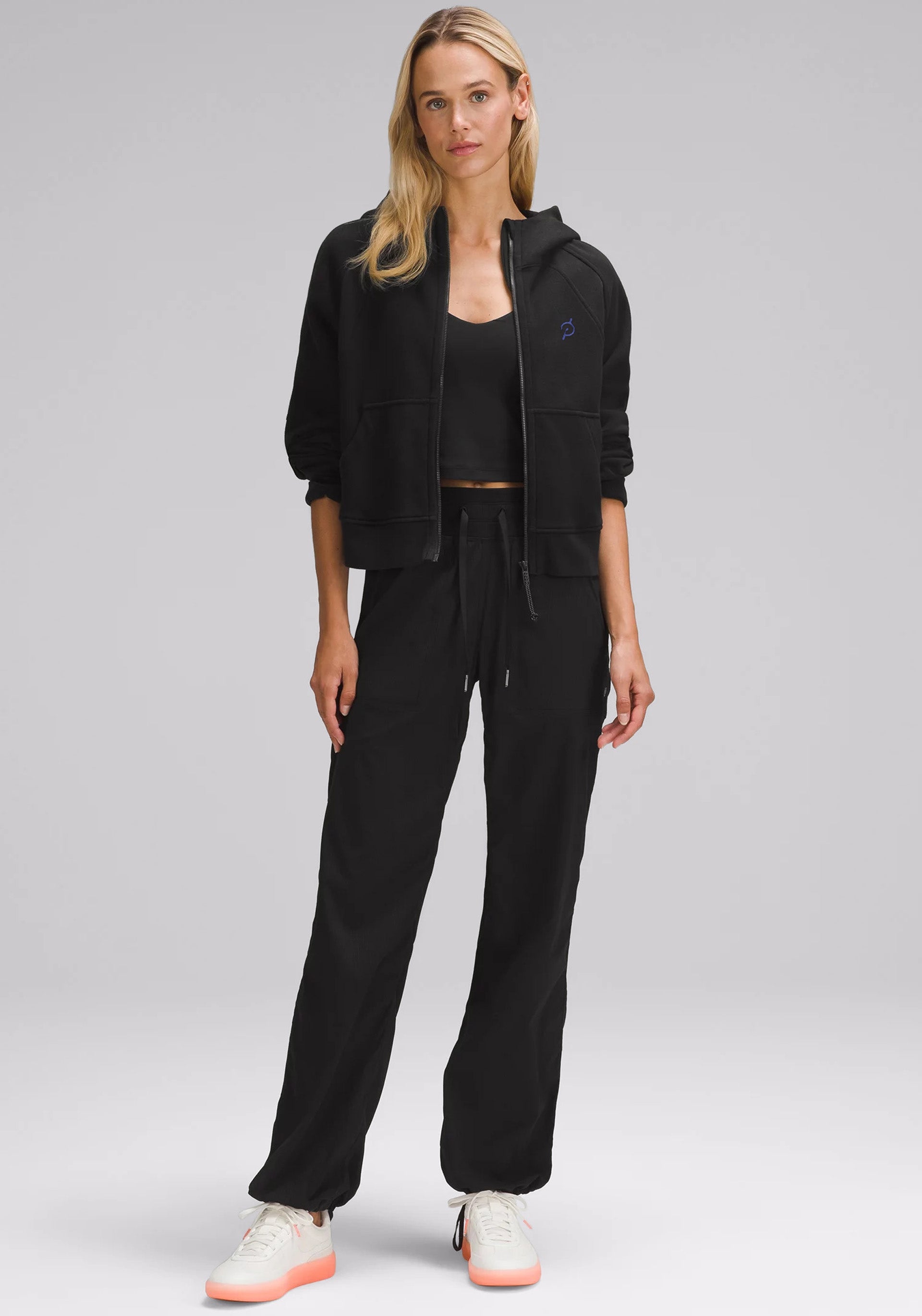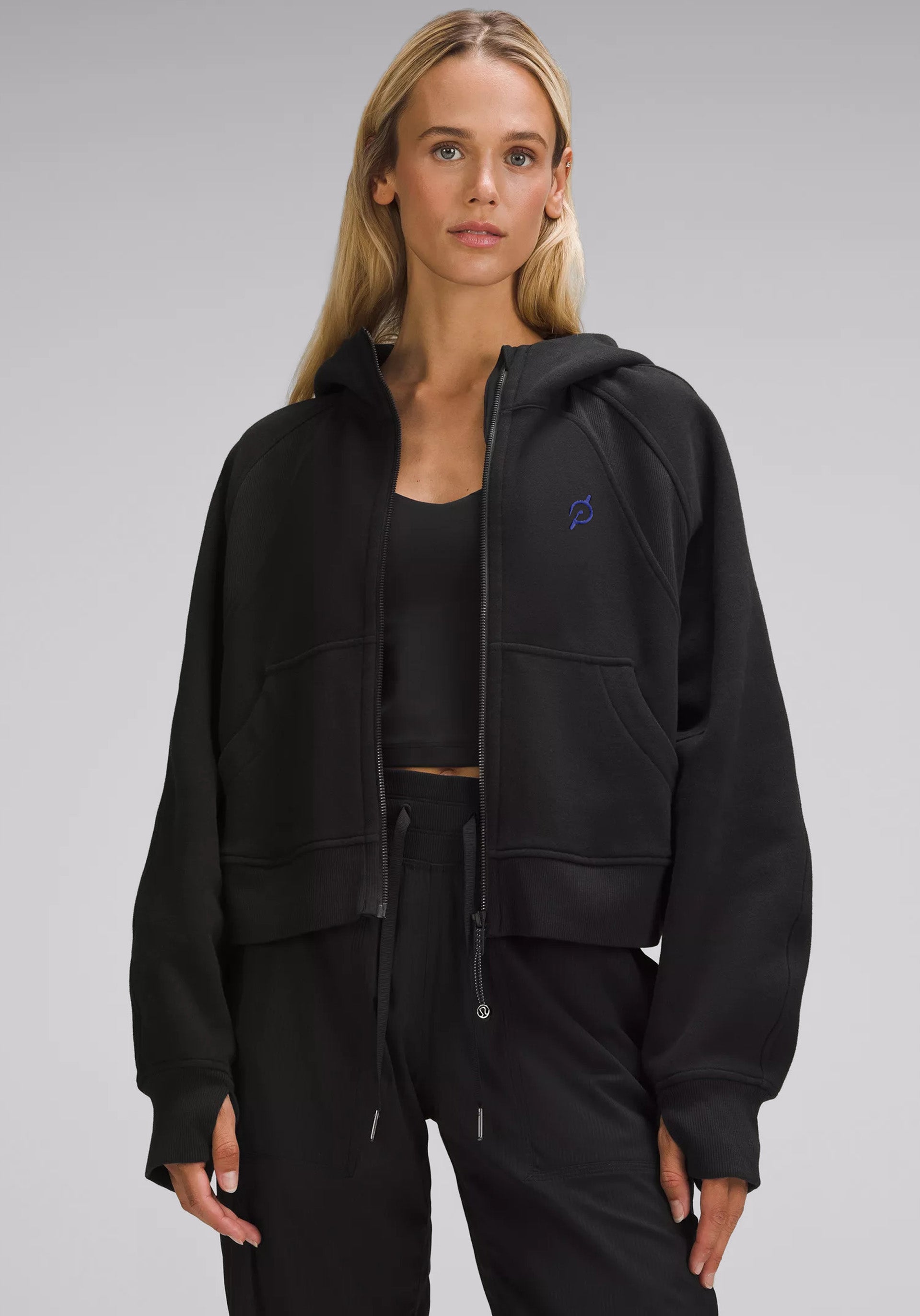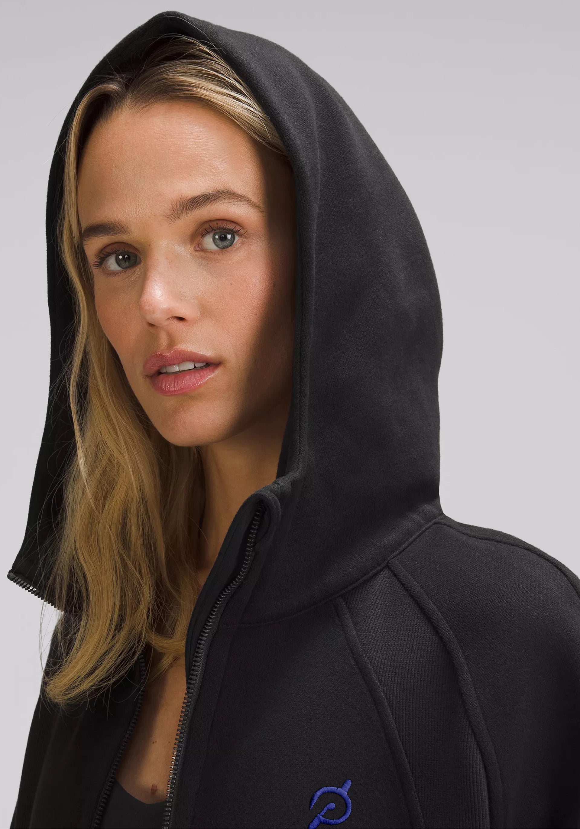 Full-zip, hooded sweatshirt with elastic zipper pull that doubles as an emergency hair tie, hand pockets with hidden phone sleeve, zipper garage, and thumbholes