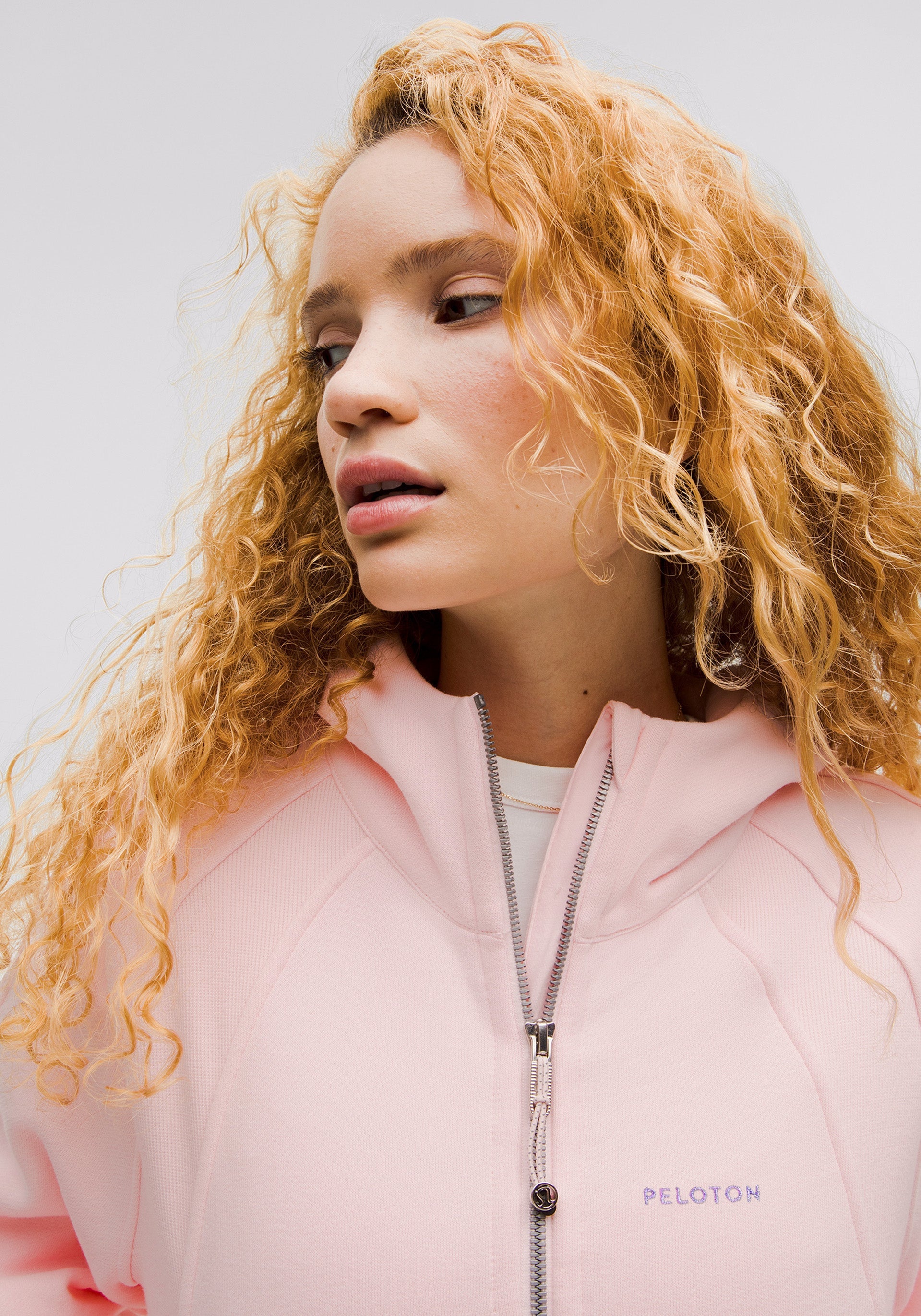 Half-zip, hooded pullover with elastic zipper pull that doubles as an emergency hair tie, kangaroo pocket with hidden phone sleeve, zipper garage, and thumbholes