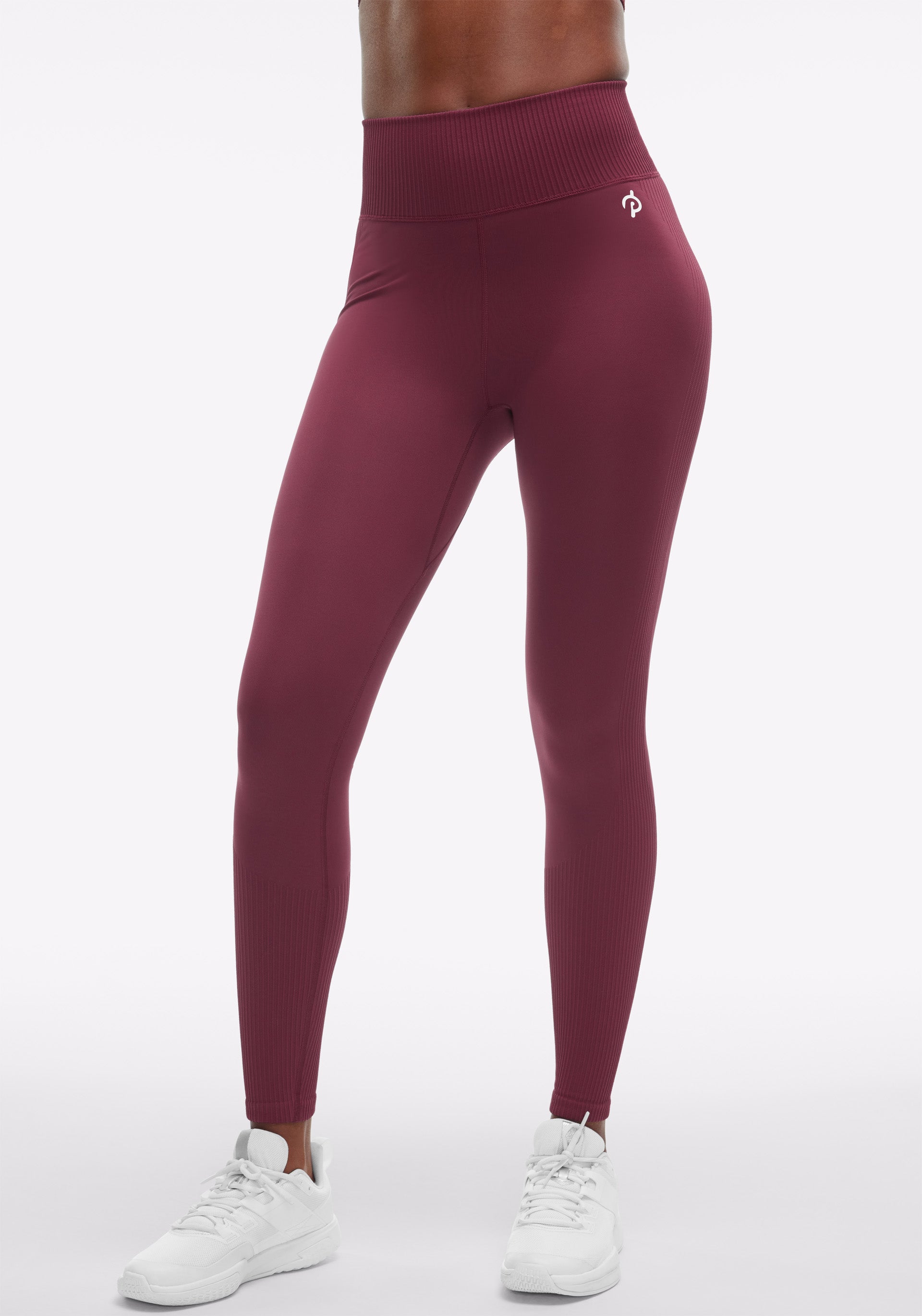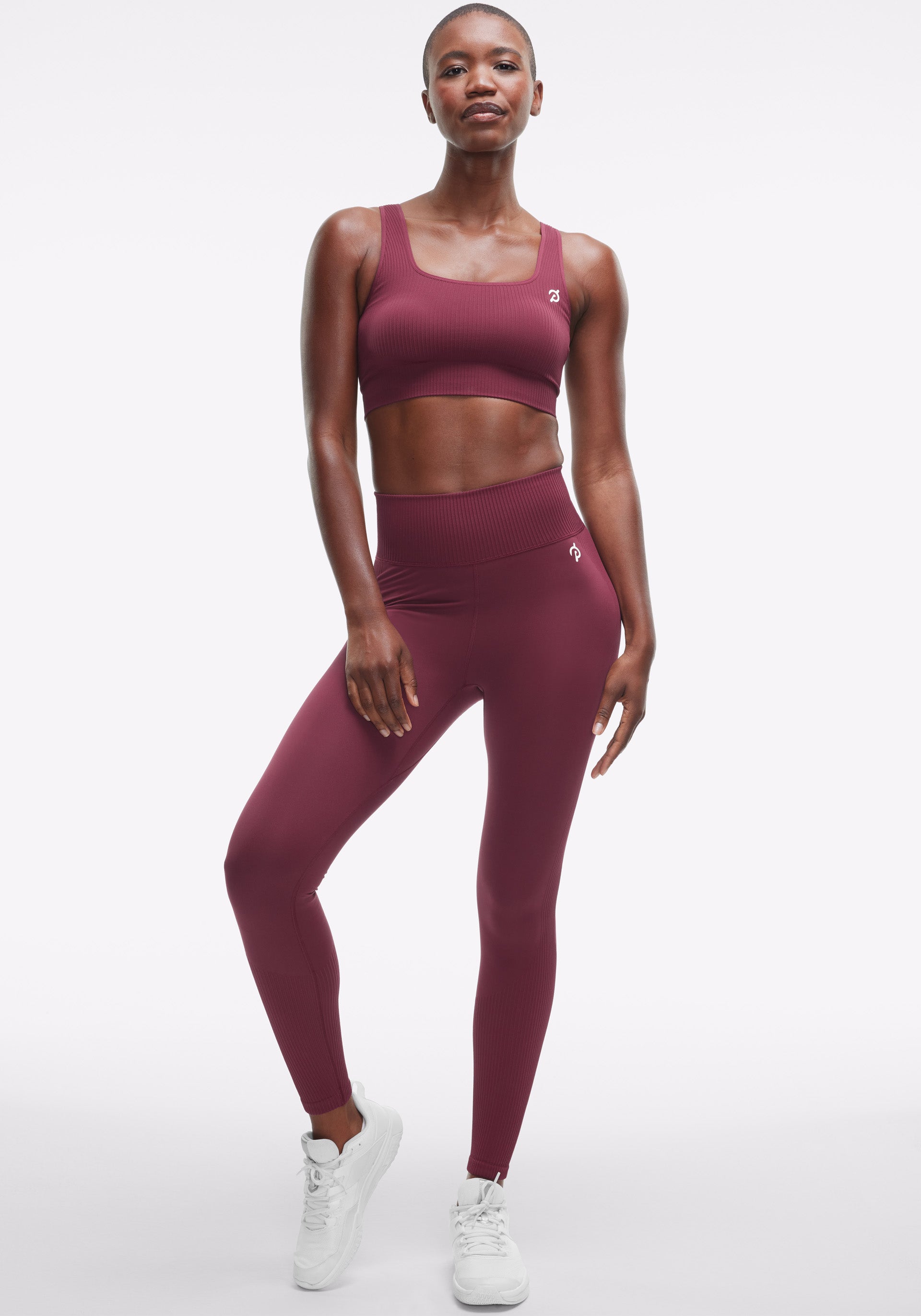 - High rise, 25” inseam legging with contour shaping at back and rib detailing at waist, side seam and lower leg