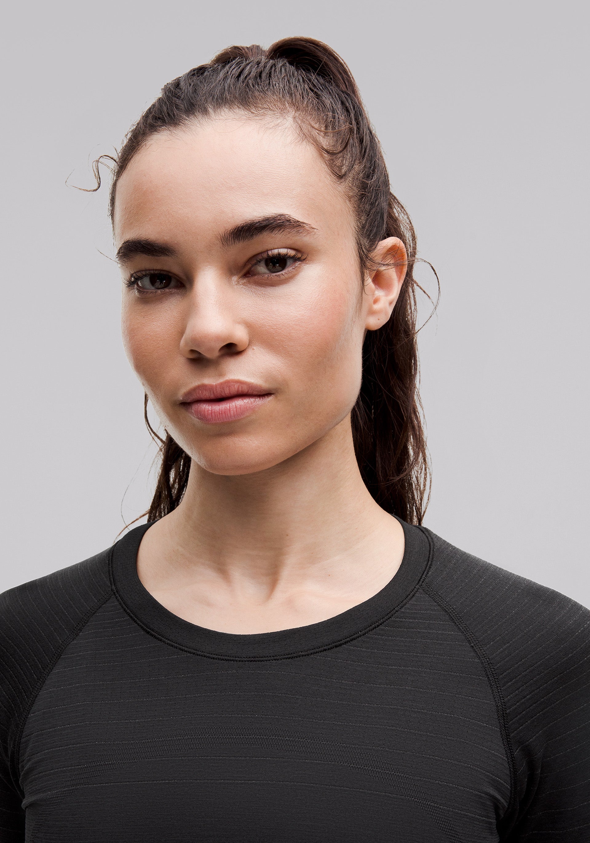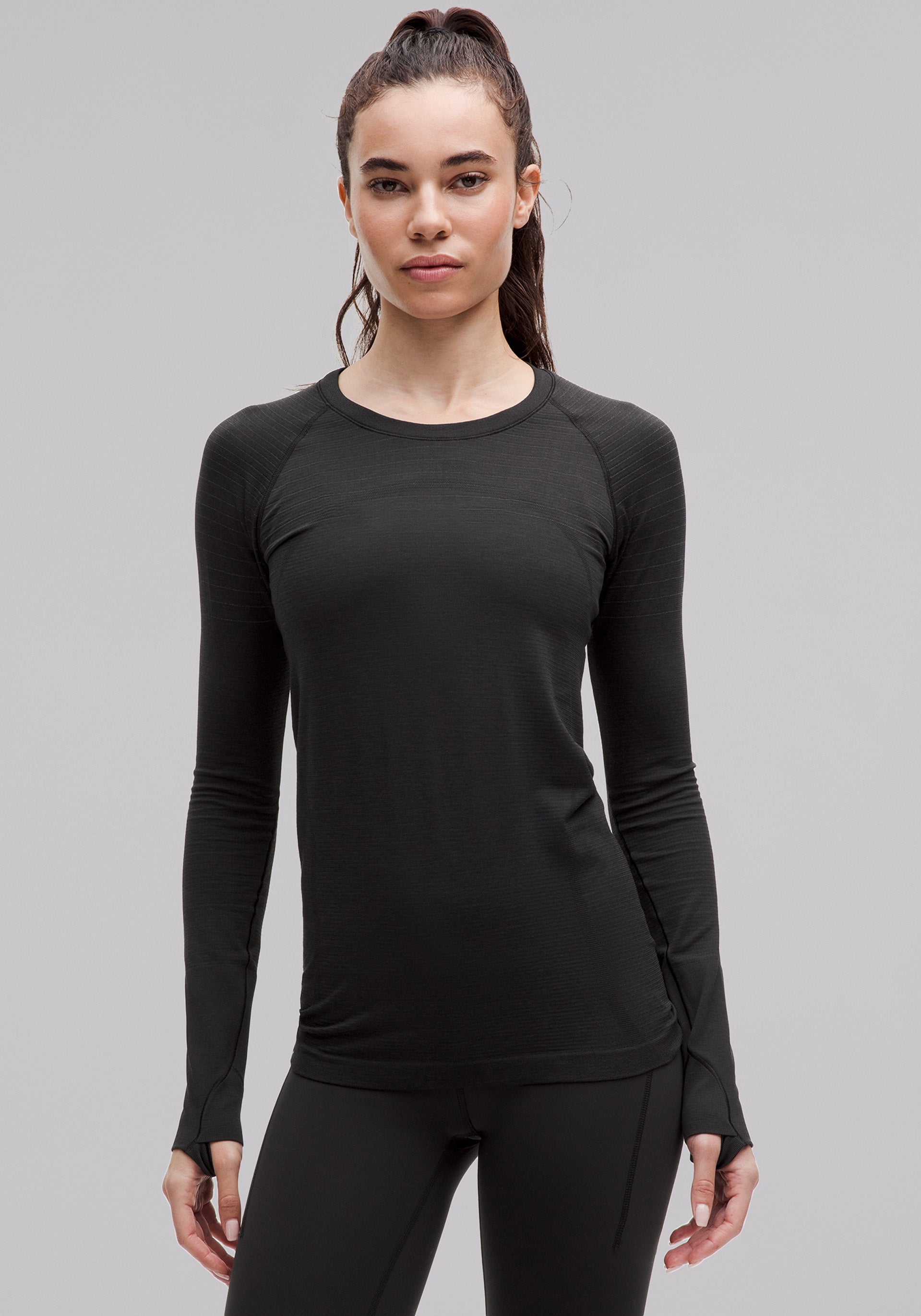 Go for the photo finish. This version of our Swiftly Tech long sleeve features a subtle stripe pattern that shines bright under a camera flash.